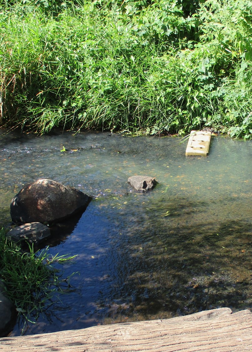 Die von rechts nach links, von vorn bis hinten stark wechselnde Wasserfärbung liegt teils an Optik, Schichtdicke. Da bachauf wenig für Struktur getan wurde, wird erst hier mit der Kies-geförderten Turbulenz (unsichtbares) gelöstes Eisen in feinsten Partikeln ausgeflockt. So entsteht der milchige Eindruck. – Die flachen kiesigen Strecken schaffen das am Besten, nicht nur Optik, sondern bereits etwas aufwärts fortgeschrittene Eisenflockung lässt das Wasser hier klar erscheinen.