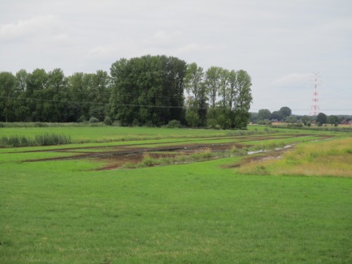 Am Hang, Holm, die lange überstaute Wiese verliert deutlich an Wasser. Fast kein Vogel interessiert sich, beim Überstau nach oben geflüchtete Bodenbewohner sind wohl alle verzehrt, Neues hat sich noch nicht entwickelt.