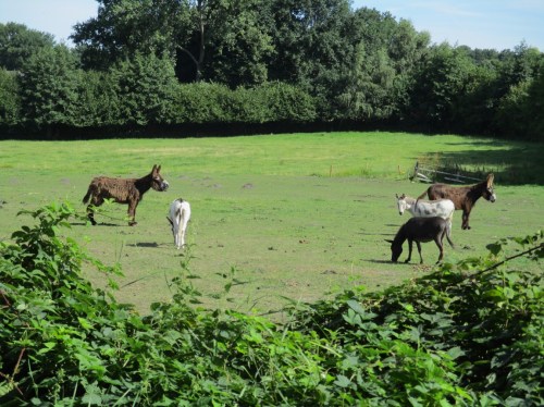Die bunten Esel auf abgefressener Weide warten auf mehr. Links wird ordentlich Lärm gemacht – Iiiii-Aaaah ! ! !