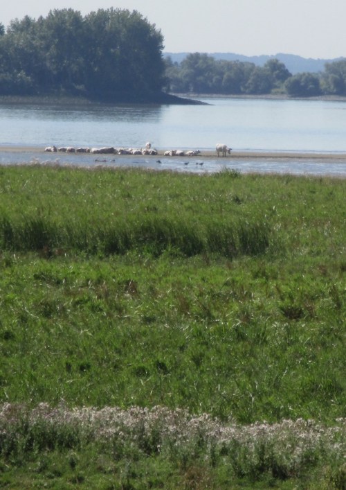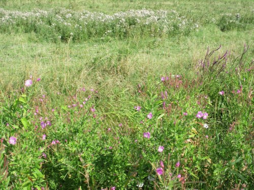 Spätsommerlich blühen hinterm Elbdeich Großes Weidenröschen, am Graben Blutweiderich – dahinter auf der Schafweide Flächen von samentragenden Disteln.