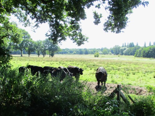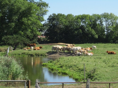 Die Rinderherde Giesensand sucht wassernahe Stelle auf, nachdem die Sonne ihnen im Tageslauf den Schatten wegnahm.