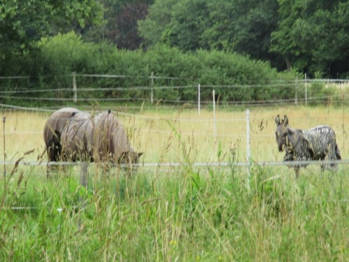 Die bunten Esel auf abgefressener Weide warten auf mehr. Links wird ordentlich Lärm gemacht – Iiiii-Aaaah ! ! !