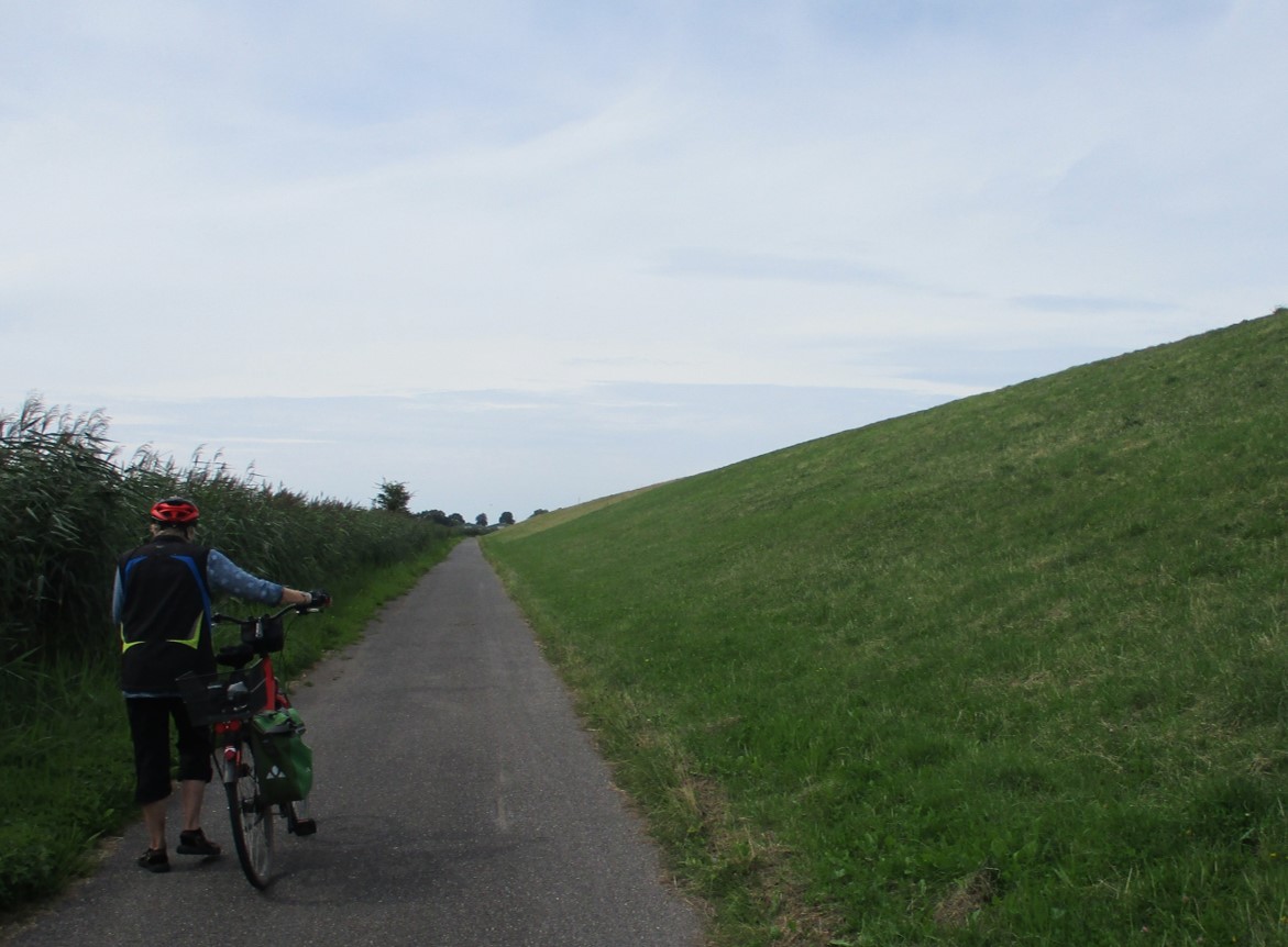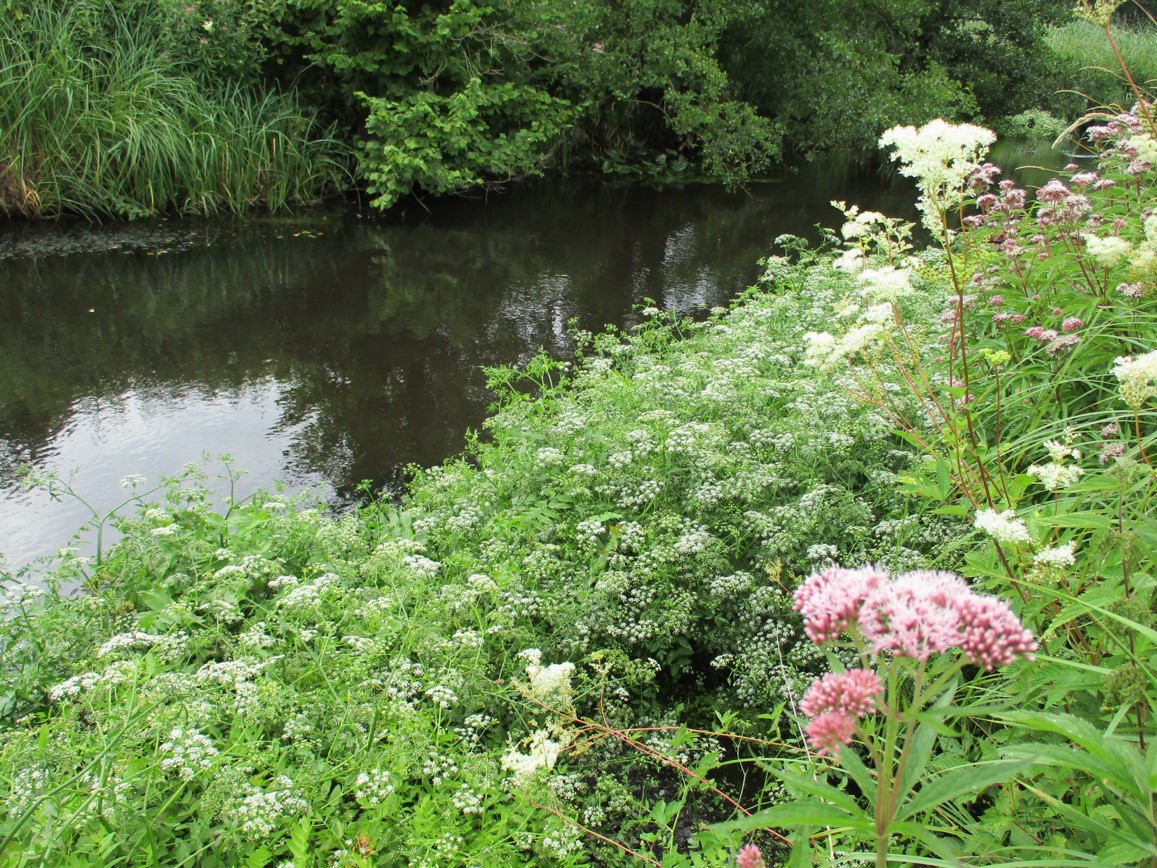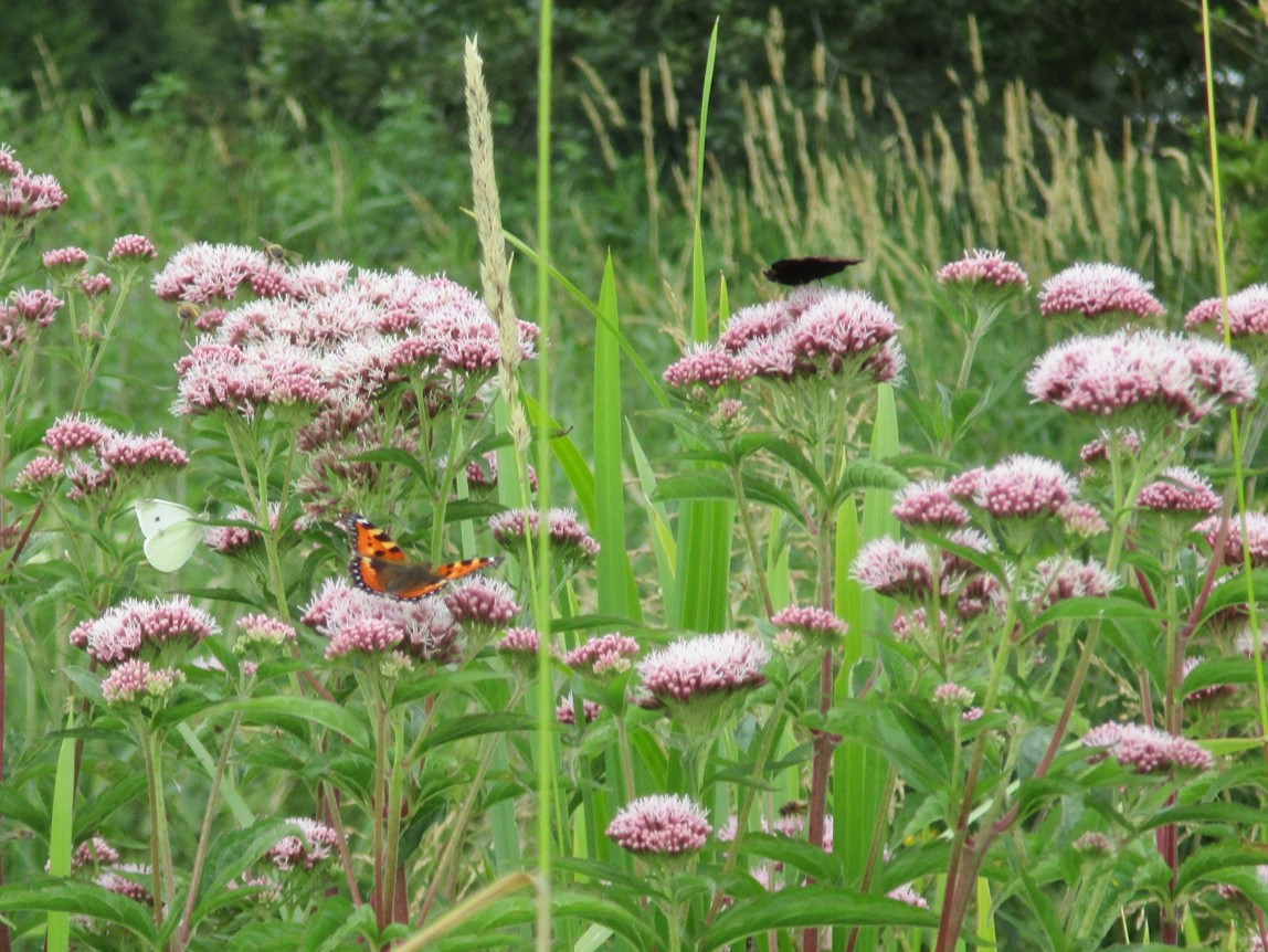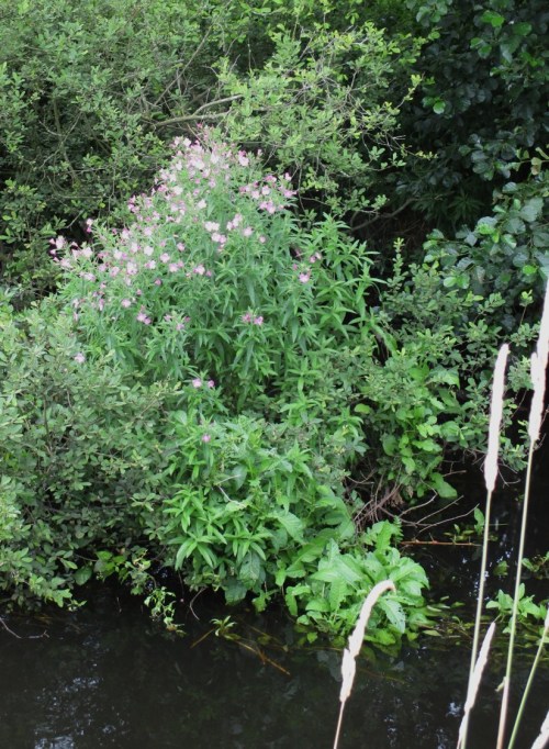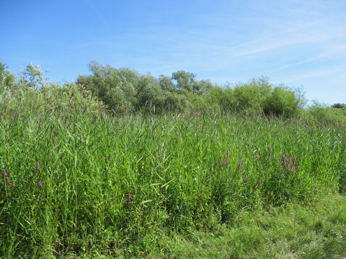 Spätsommerlich blühen hinterm Elbdeich Großes Weidenröschen, am Graben Blutweiderich – dahinter auf der Schafweide Flächen von samentragenden Disteln.
