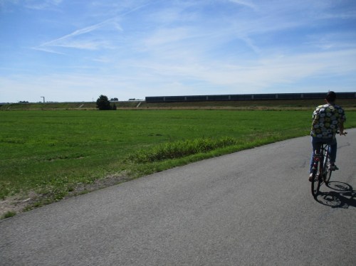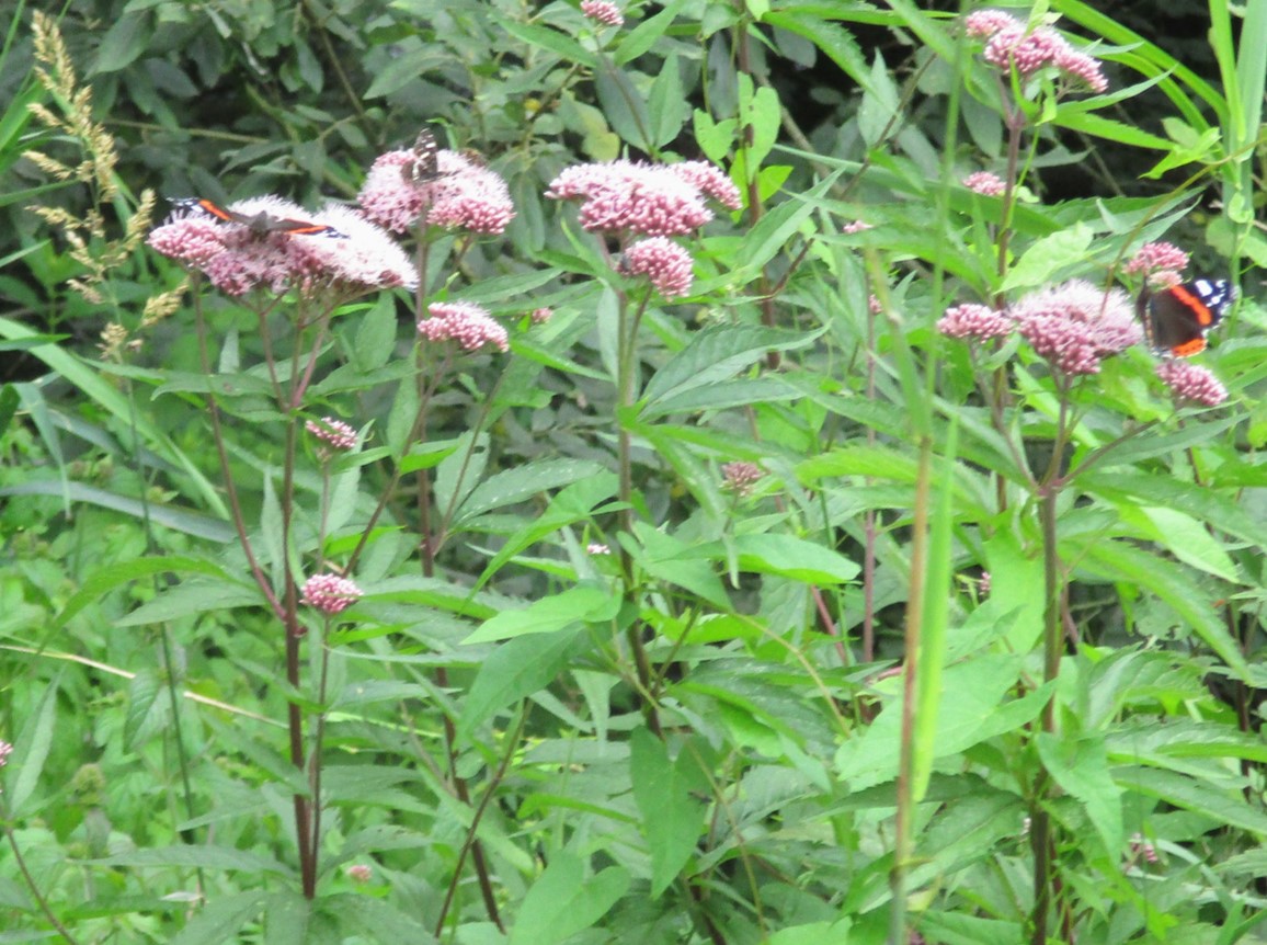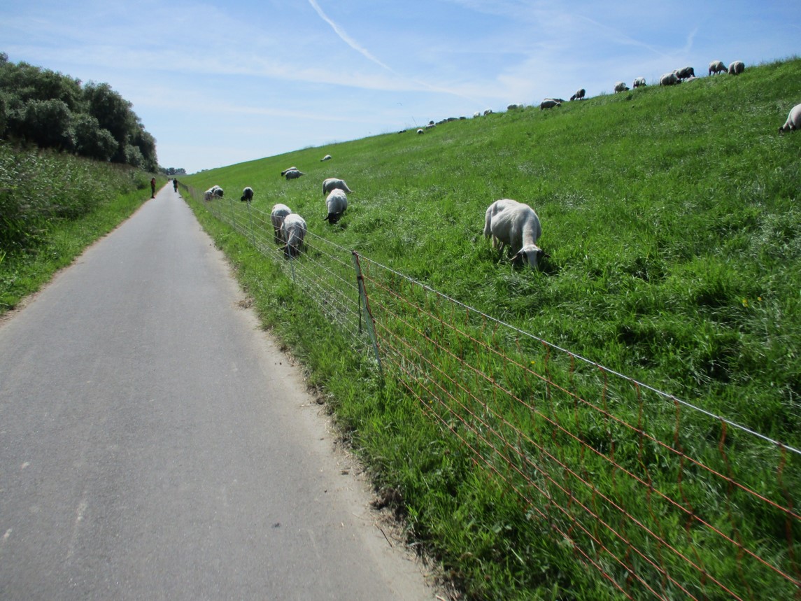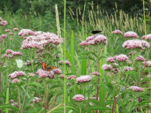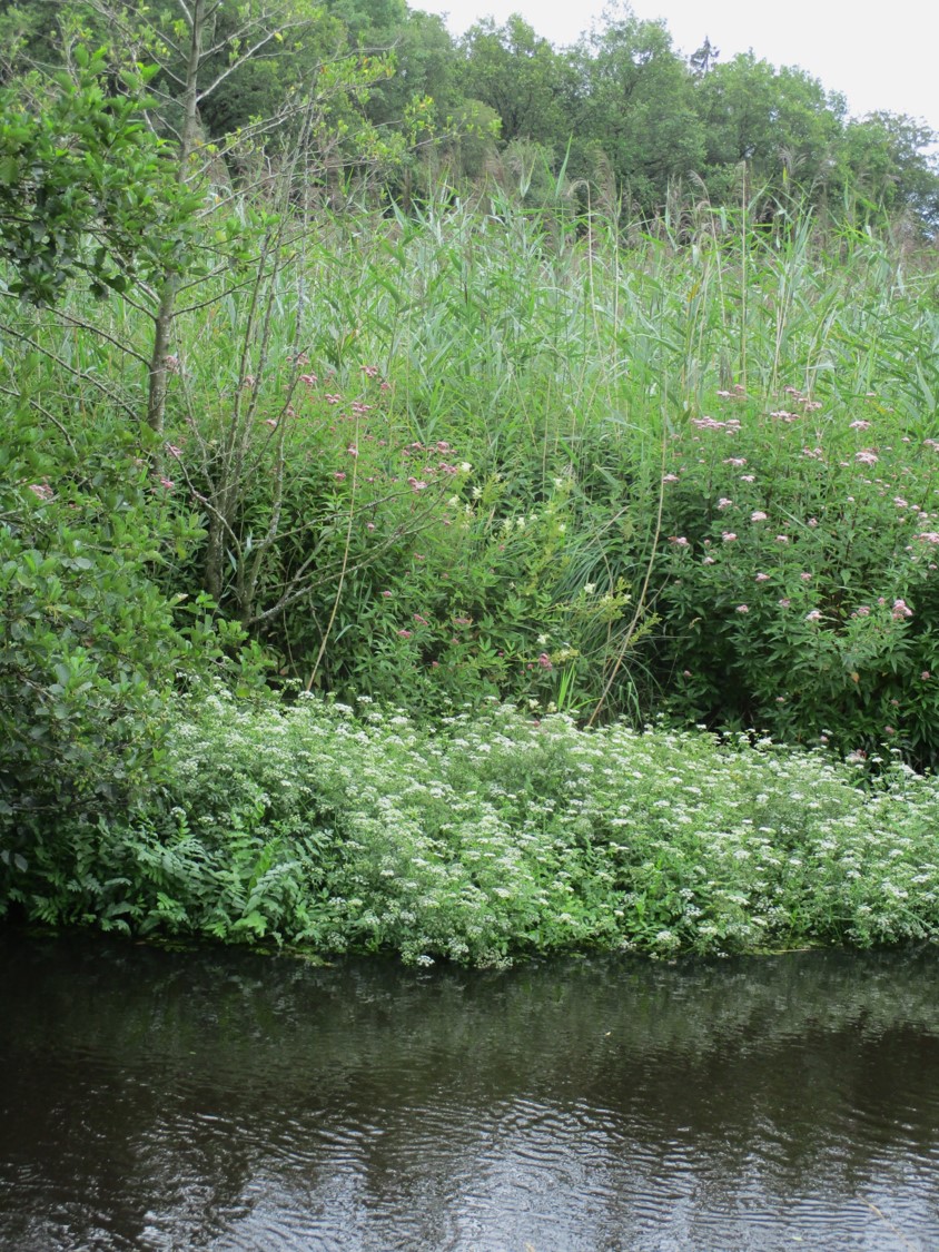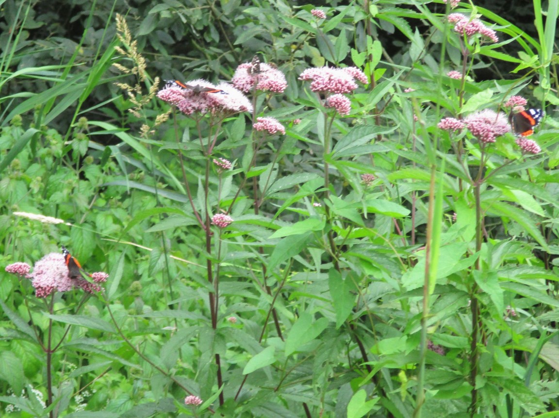 Spätsommerlich blühen hinterm Elbdeich Großes Weidenröschen, am Graben Blutweiderich – dahinter auf der Schafweide Flächen von samentragenden Disteln.