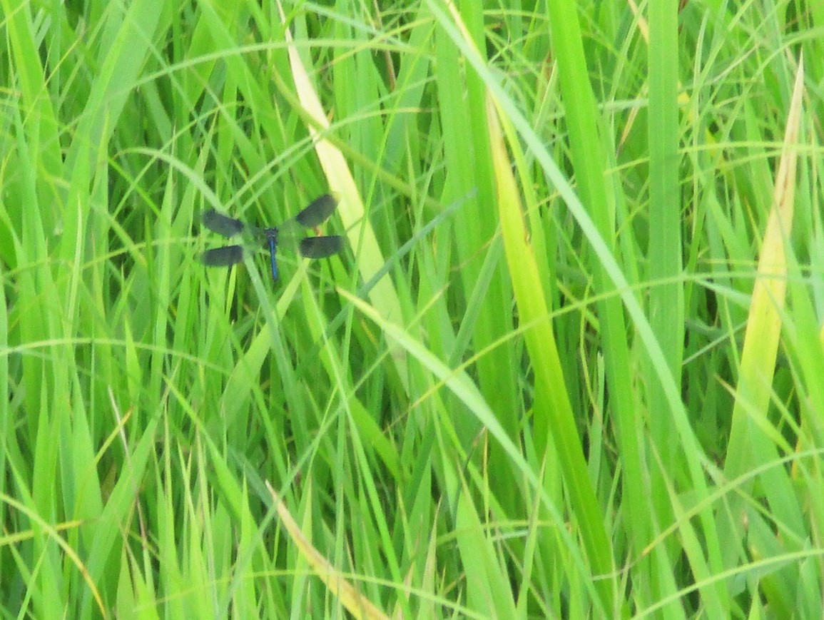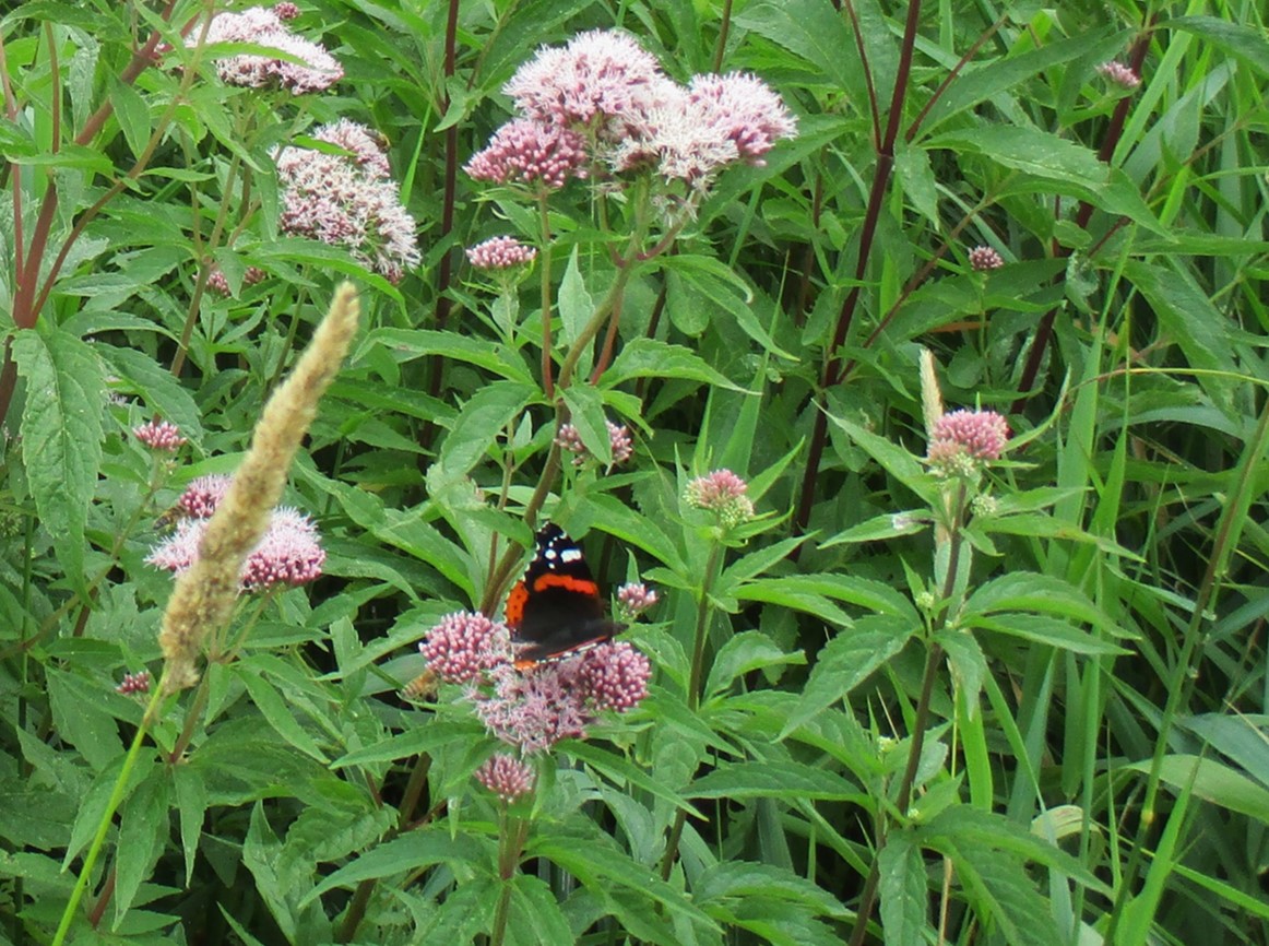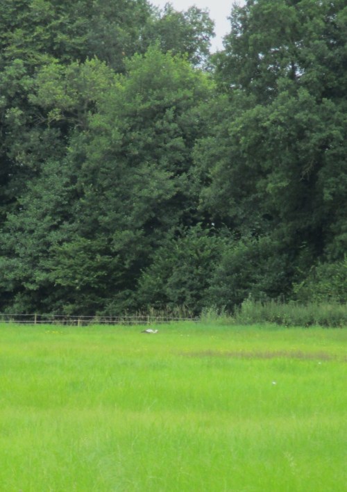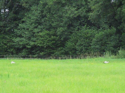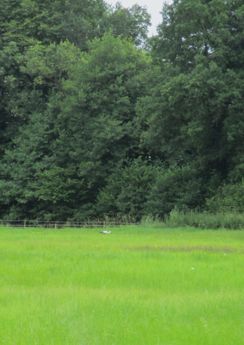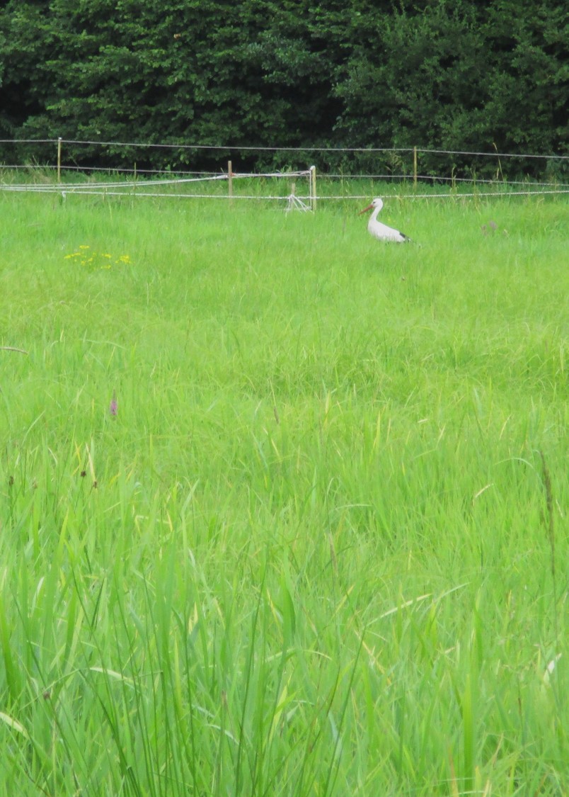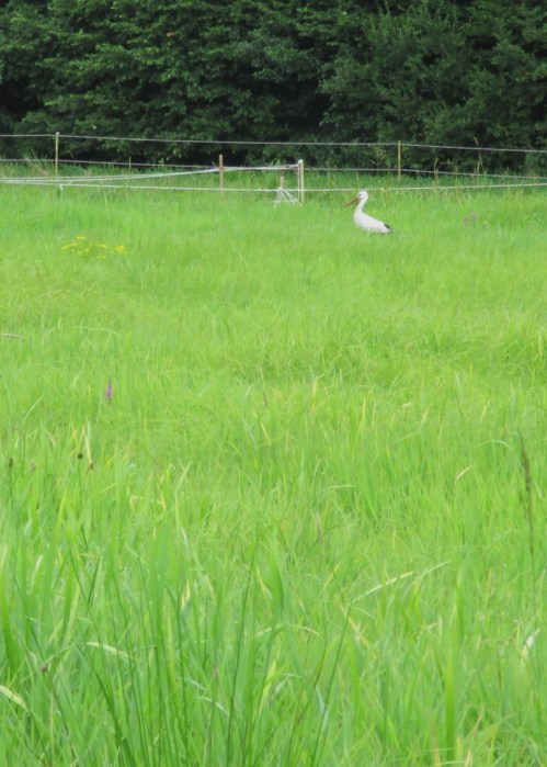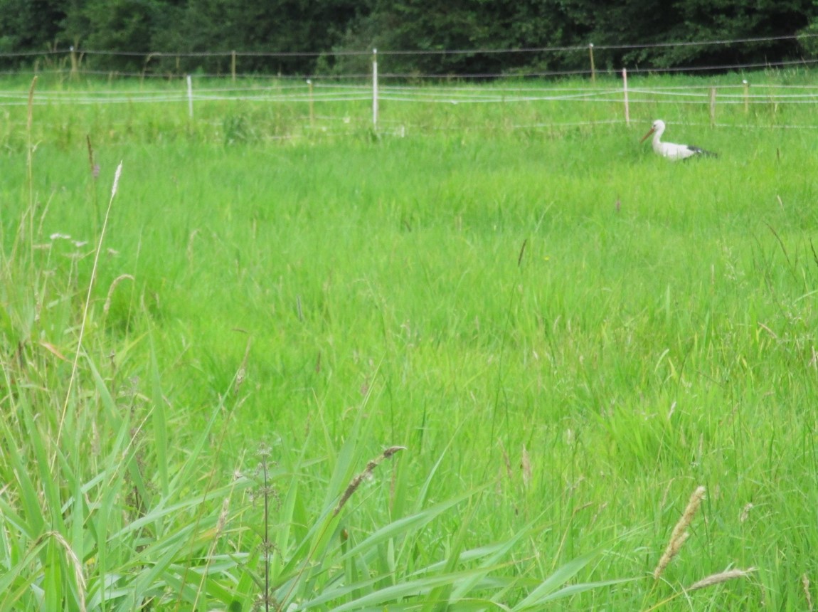 Nebendran, auf einer nur teilgemähten Wiese scheint es unter dem zusammengesunkenen Bewuchs interessant – Mäuse – und mehr? Immerhin sind zwei Weissstörche beschäftigt.