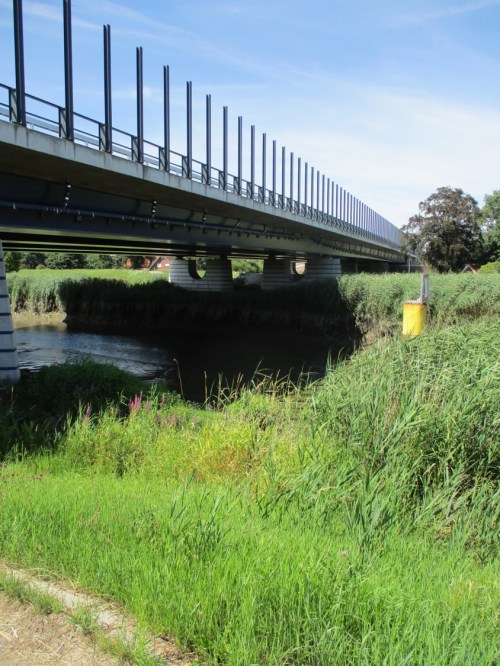 Die von rechts nach links, von vorn bis hinten stark wechselnde Wasserfärbung liegt teils an Optik, Schichtdicke. Da bachauf wenig für Struktur getan wurde, wird erst hier mit der Kies-geförderten Turbulenz (unsichtbares) gelöstes Eisen in feinsten Partikeln ausgeflockt. So entsteht der milchige Eindruck. – Die flachen kiesigen Strecken schaffen das am Besten, nicht nur Optik, sondern bereits etwas aufwärts fortgeschrittene Eisenflockung lässt das Wasser hier klar erscheinen.