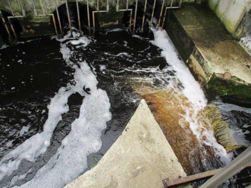 In aus den Nachklärbecken Richtung Elbe zusammenfliessender dickerer Schicht erscheint das Wasser gelblich. Schwerer abbaubare, teils neu gebildete Substanzen – Huminstoffe genannt – sind hierfür verantwortlich.