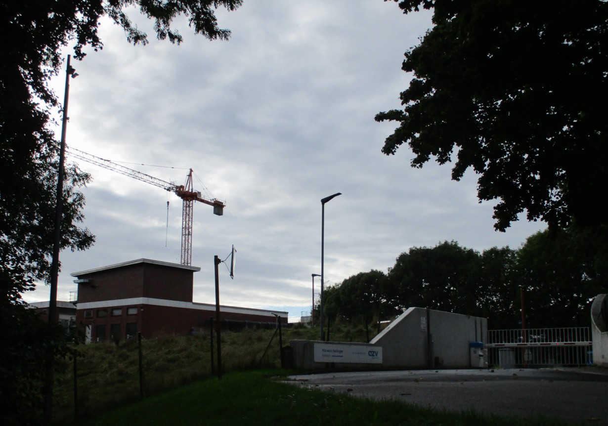 So trafen wir uns also am Sonnabend Vormittag am Eingangstor. – Kran: Klärwerke werden dauerhaft modernisiert, instandgesetzt, eigentlich wird immer irgendwo gebaut.