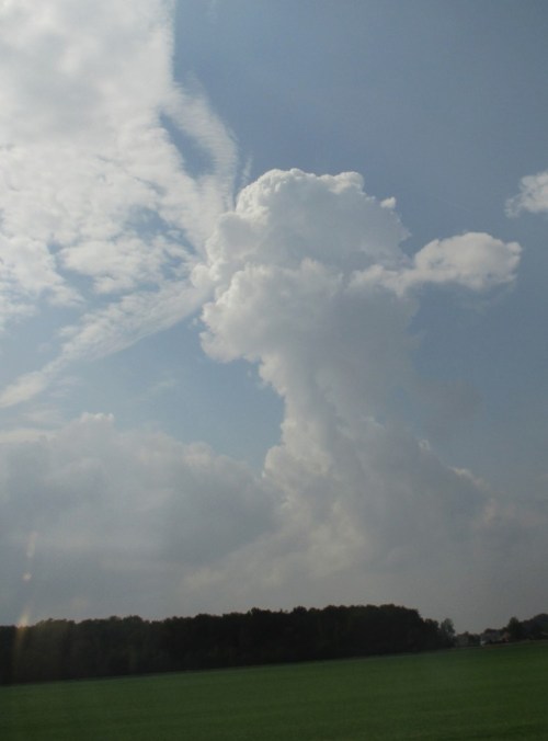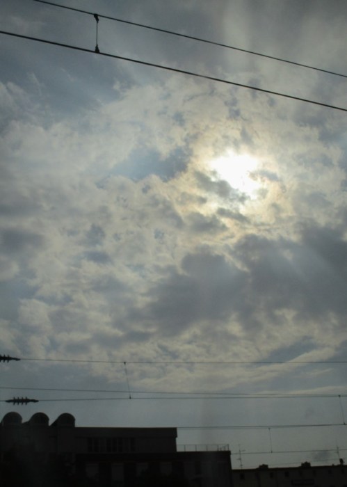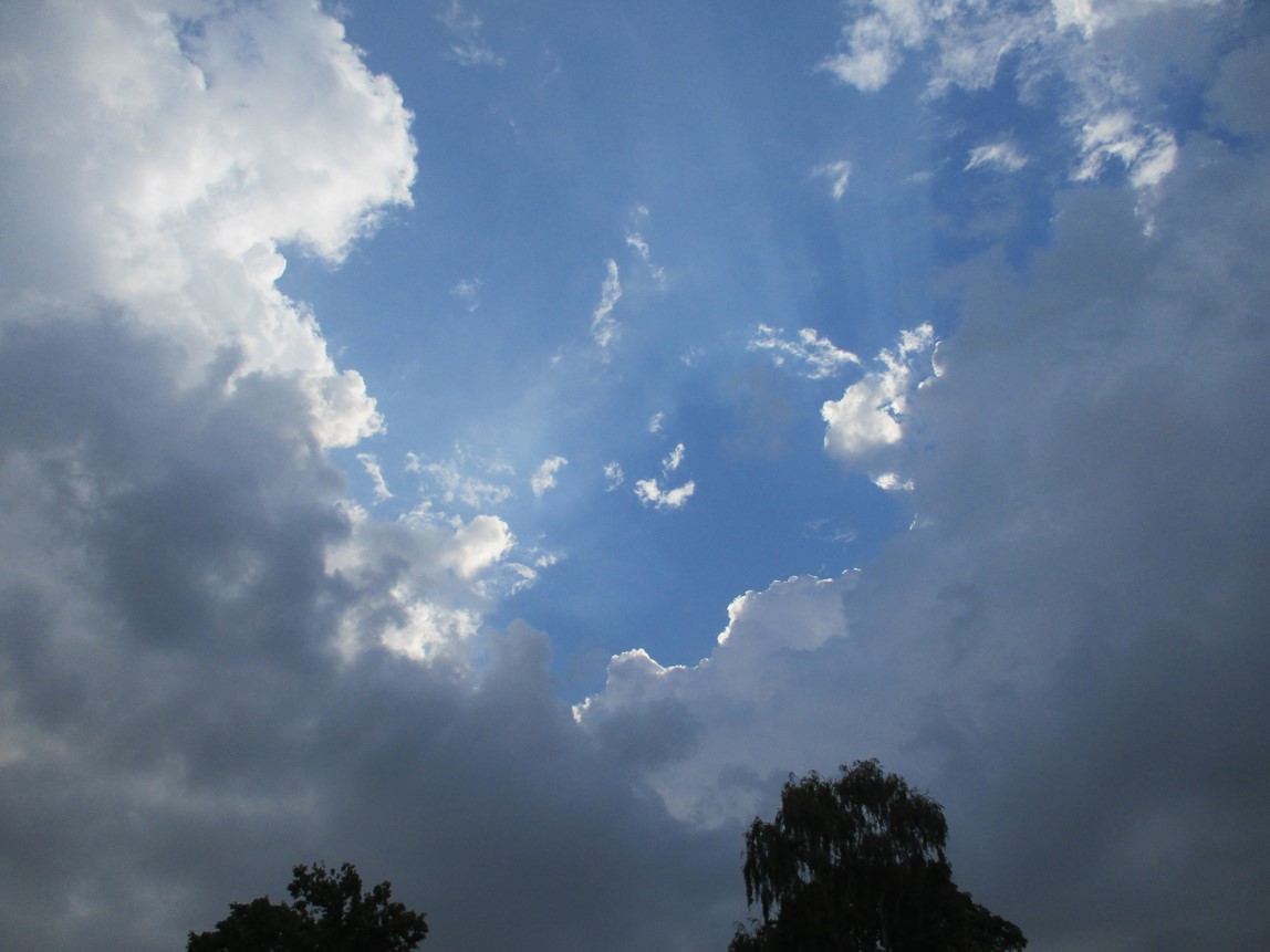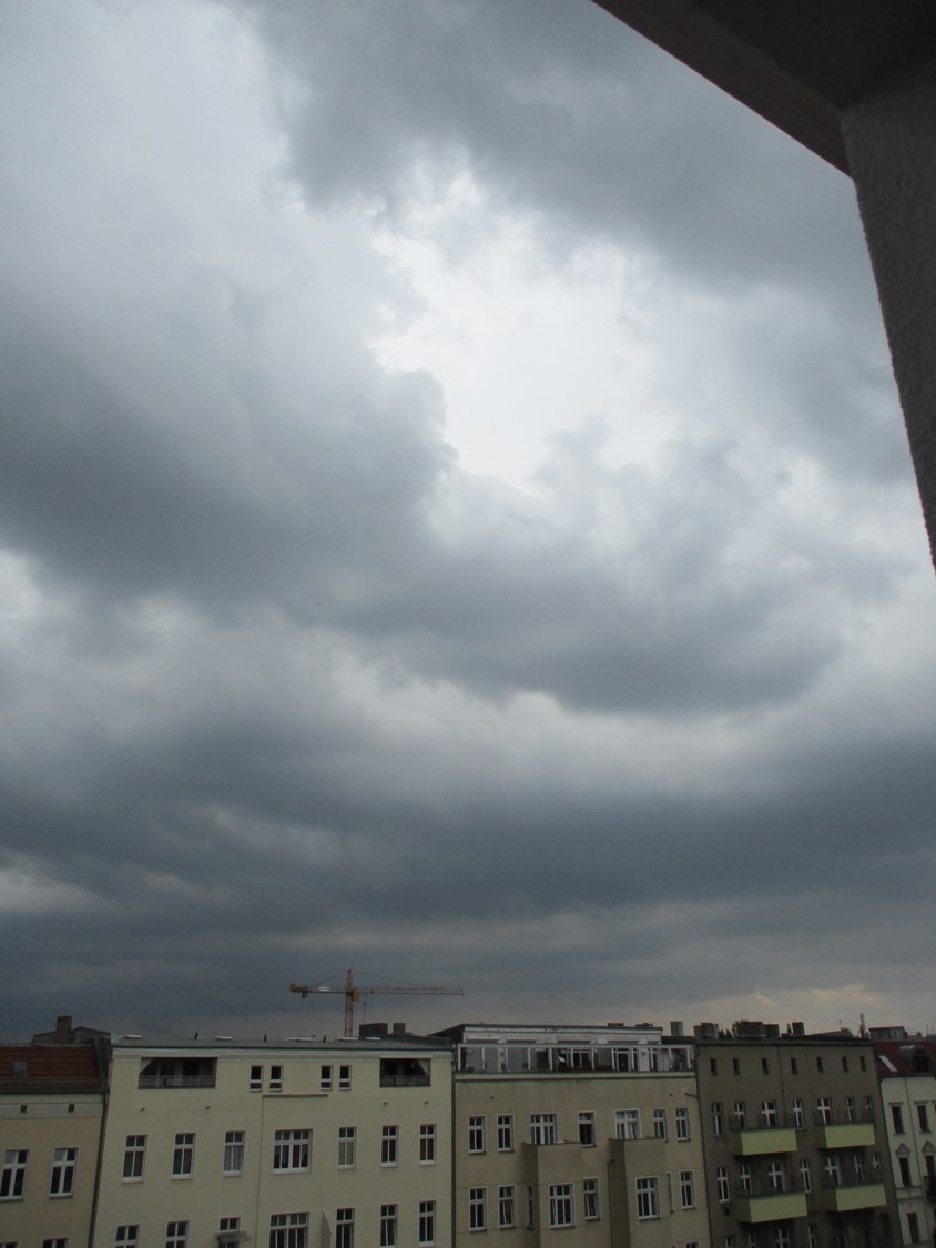 Am Morgen drauf, Berlin-Reisetag. Der Blick aus dem Wohnzimmer gen Westen zeigt Morgensonne-beschienene Wolkengebilde vor blauem Himmel.