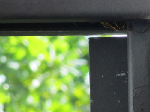 Des Rätsels Lösung: Im Balkongeländer ist offenbar ein Nest Wespen. Statt Interesse an unserem Eis und / oder Kuchen hatten die anderes zu tun. Eifriges Ventilieren war offenbar am Flugloch unter dem Geländer angesagt – Eier, Larven ff. wären wohl sonst von direkter Sonne auf dem „Geländer-Backofen“ innen gebacken worden.