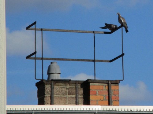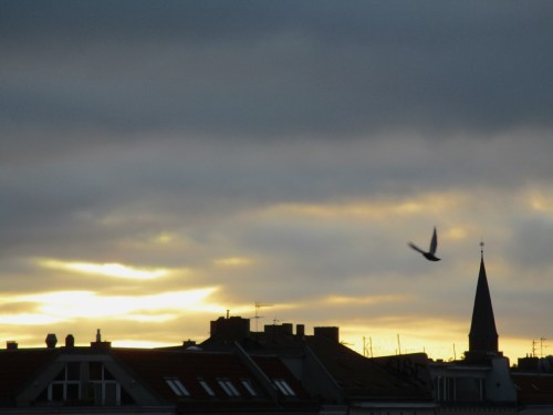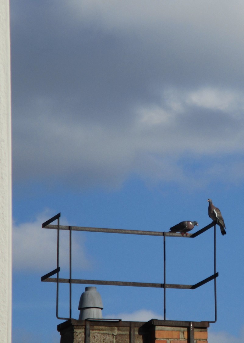 Nebelkrähen und Ringeltauben jagen in getrennten Trupps durch die Straßenschlucht, kommen hoch, drehen – los geht`s, wieder andersrum.