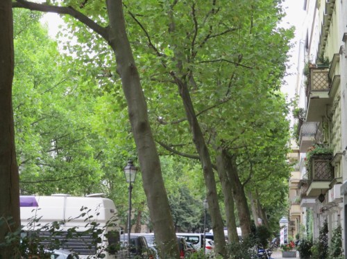 Hier sind es allerdings (nur?) die Platanen, die derart nach dem Licht wachsen, standsicher. Interessant während der Runde zu sehen: Andere Baumarten stehen senkrecht, gerade.