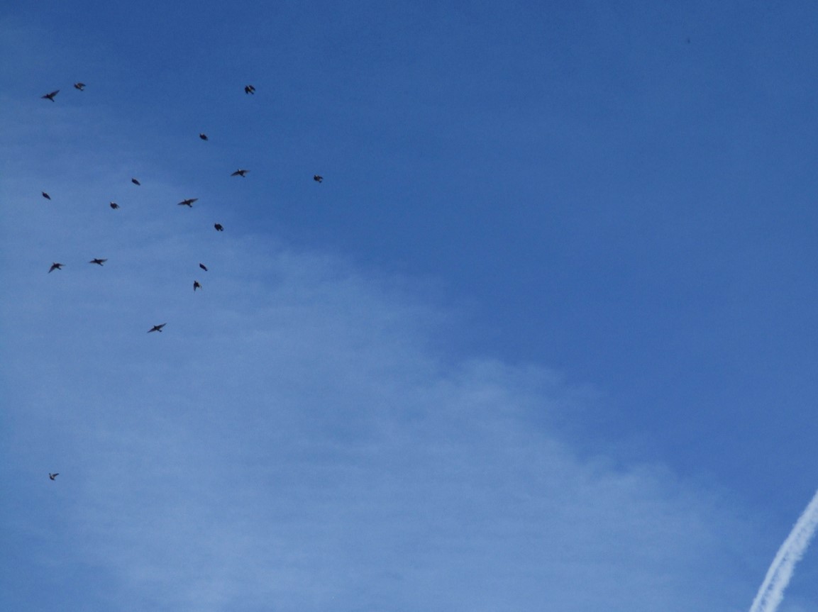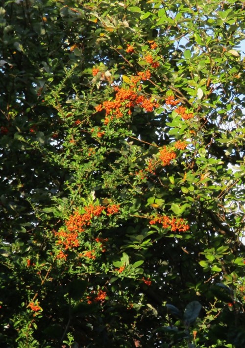 Im Grün ringsum im Bebauten – Rotfärbungen, Beispiel Feuerdorn. Erstaunlich – nachdem der dieses Jahr so vertrocknete Fruchtansätze zu haben schien, kommen jetzt doch die Früchte in Farbe und Form noch voran.