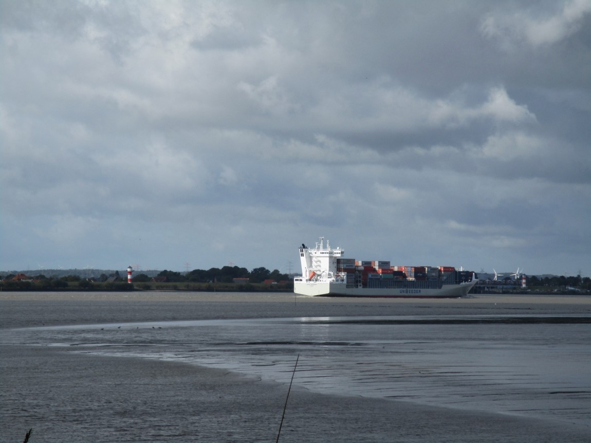 Angeschienen von der Vormittagssonne zieht bei mittlerer Ebbe ein kleiner Containerfrachter an der Mündung der Wedeler Au / Binnenelbe vorbei.