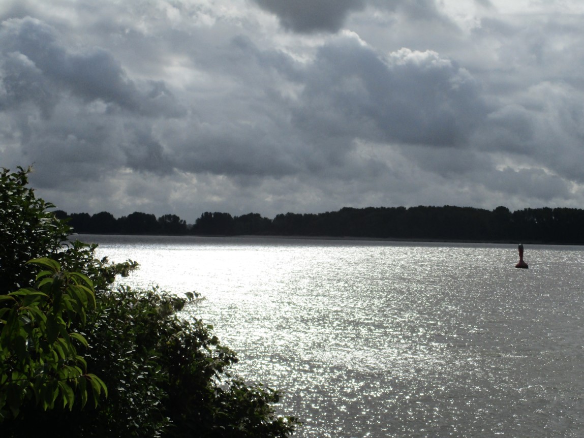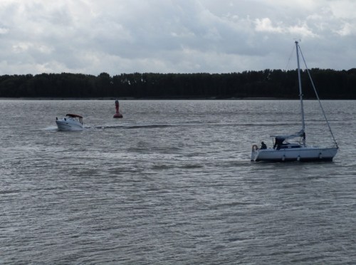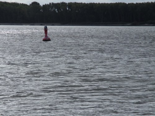 Das Elbewasser fliesst nach rechts, der Wind bläst von daher. Vorn ist eine Strömungs- / Wellen-Unregelmäßigkeit zu erkennen, die durch die Ausfahrt (das auslaufende Ebbwasser) des Yachthafens hervorgerufen wird.