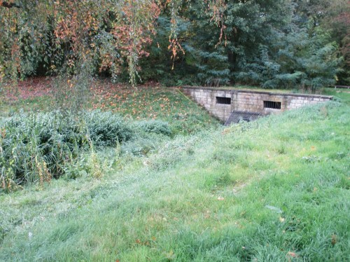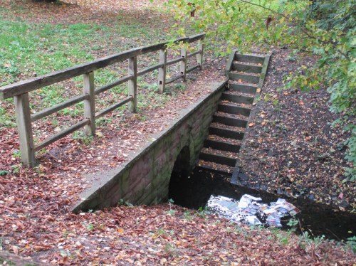 Bachab des Auslaufbauwerks: Typische Kulturtat des (nicht nur) städtischen Menschen, Wegwerfen von irgendwas, hier Werbeblätter – ab ins Gewässer.
