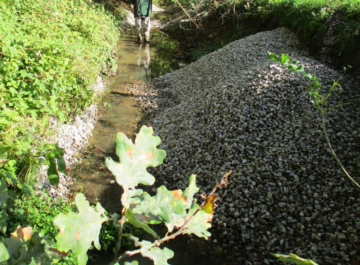 Wir hatten an einer übertiefen und -breiten sommertrockenen Bachstrecke punktuell Kiesdepots zum Schutz von Nutzland sowie als neues Lebensraumangebot jeglicher Organismen angelegt, die Sohle leicht erhöht.