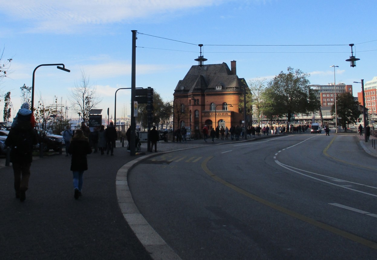 Und wieder – Menschenmengen drängen weiter gen Hafen, Elphi (neben denen, die ins Portugiesenviertel abzweigten). Wir bleiben auf dieser Straßenseite.