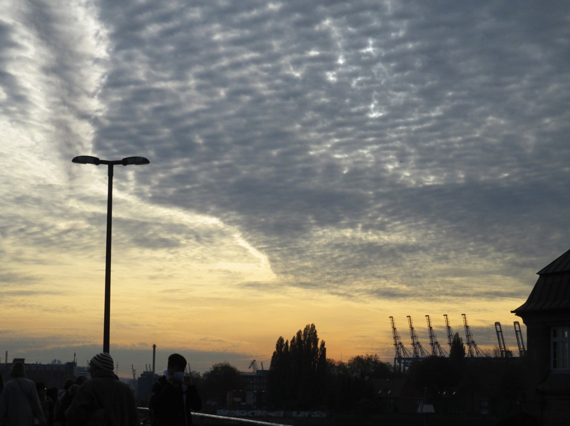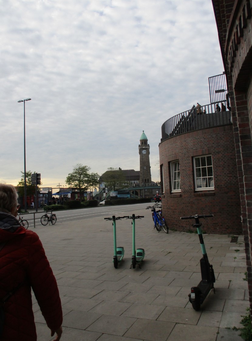 Dazu nutzen wir die Elbe-abgewandte Seite des Hochwasserschutzes Landungsbrücken – der Menschenauftrieb auf der „Guck-Seite“ ist uns zu dicht geworden.