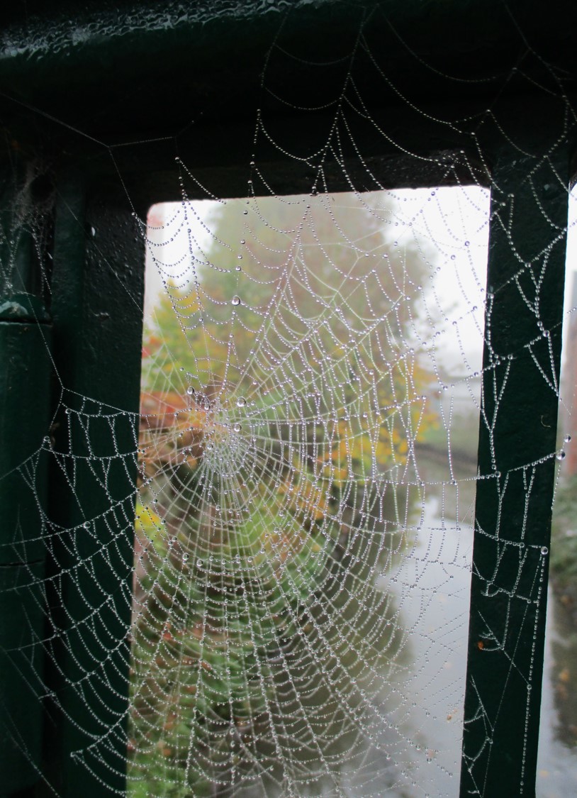 Spinnennetz mit Morgentau, Mühlenstraße Pinneberg – Blick auf die bei Tidehochwasser in Mündungsnähe durch die Tide-Pinnau eingestaute Mühlenau.