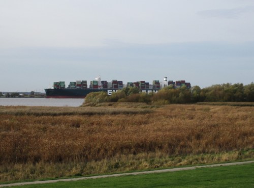 Bevor ich nach Hause radelte, kletterte ich auf den Deich und sah den hinter dem Hetlinger Heuhafen erblickten, inzwischen querab Fährmannssand angekommenen Containerfrachter – eine andere Hunderter-Nummer.