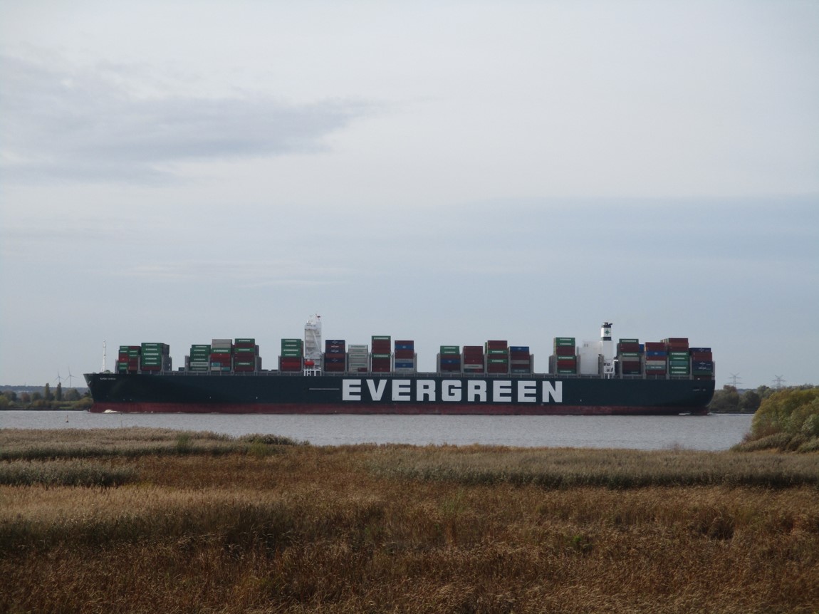 Die erste scheinbare Hochhaus-Silhouette stellte sich als Containerfrachter Ever Given heraus – 400 x 59 m, Tiefgang 10,5 m.