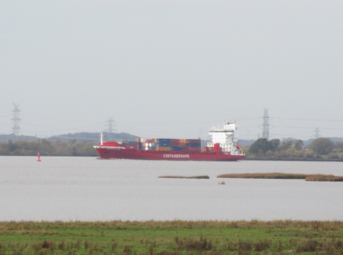 Es gibt auch kleinere Containerfrachter, hier – leicht verwackelt – die Containerships VIII, 155 x 22 m, Tiefgang 7,6 m.