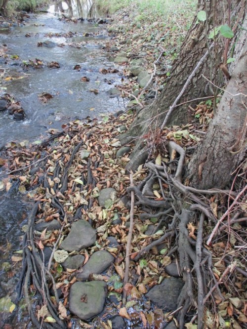 Blick bachauf – auch in Erlenwurzeltellern liegen Grob- bis Großsteine. Die legen wir demnächst mal anderswo in die Sohle, eröffnen wieder die Dreidimensionalität der Erlenwurzeln.