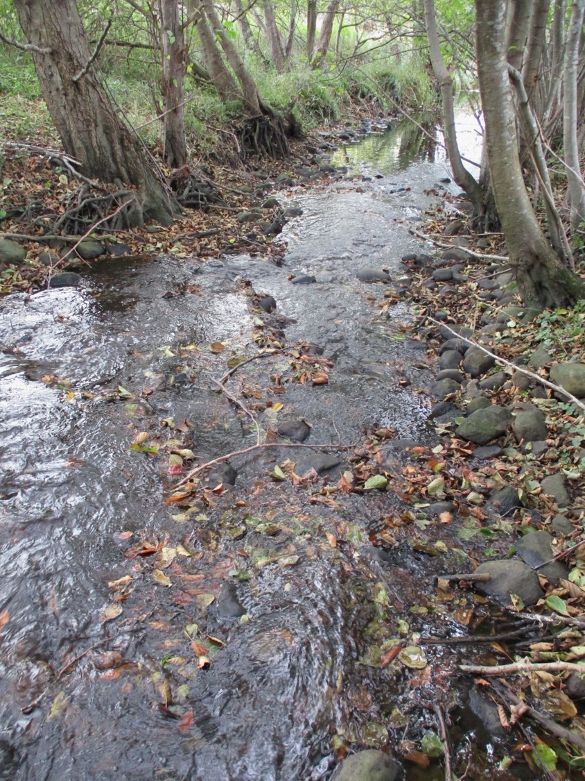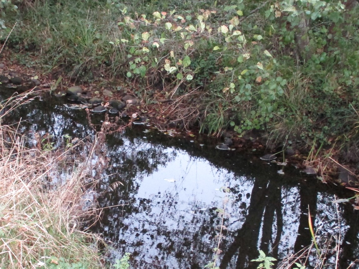 Kurzer Stopp auf der Rückfahrt, anderer Bachoberlauf, ähnliche Themenstellung. Hier ist es die Übertiefe und resultierende Ufersteilheit, die vielerlei Probleme eröffnet. Wir sind geübt im Mindern solcher Störungen, merken uns die gut anfahrbare Stelle.