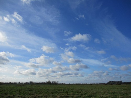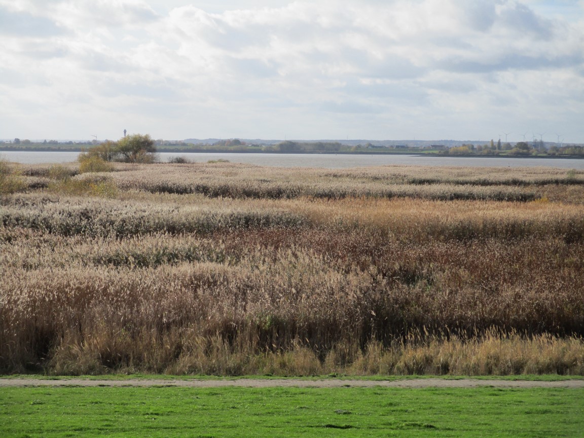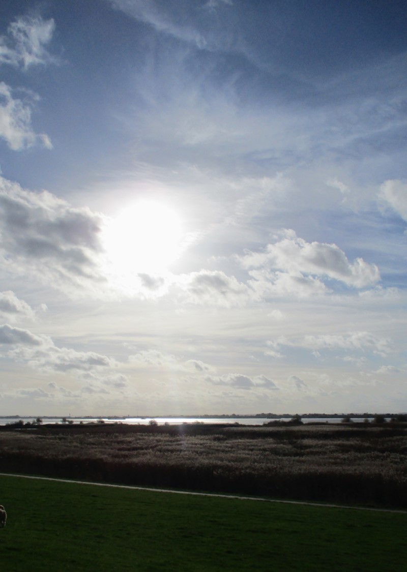 Weit geht der Blick über Süßwasserwatt, Tide-Elbe, niedersächsische Marsch bis zur Stader Geest am Horizont.