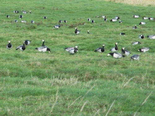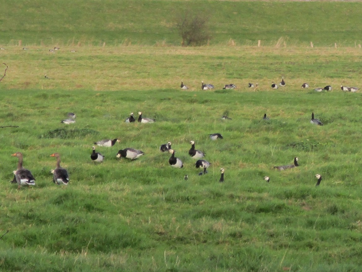 Bereits beim Betrachten der Nonnengänse fällt mir dieses Jahr auf, dass sie zusammen mit Blessgänsen auftreten – hier eine gesonderte Gruppe.
