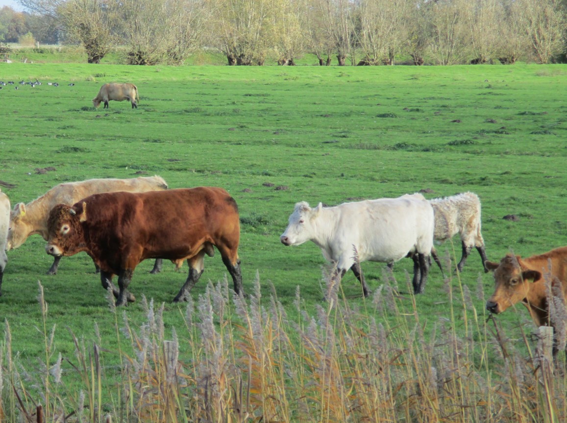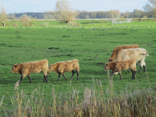 Binnendeichs, Giesensand – die Rinderherde kommt gestiefelt daher – im Hintergrund eine größere Gruppe Nonnengänse.