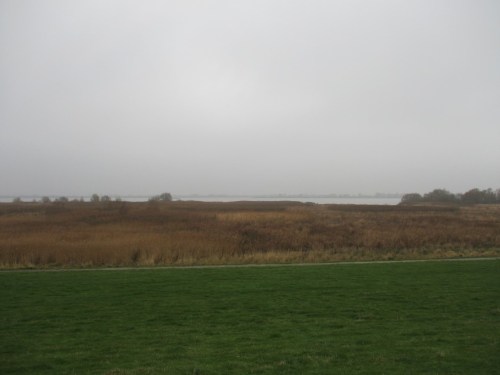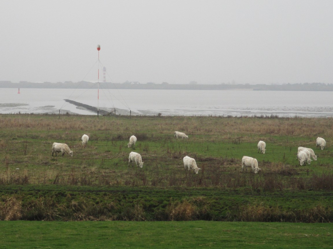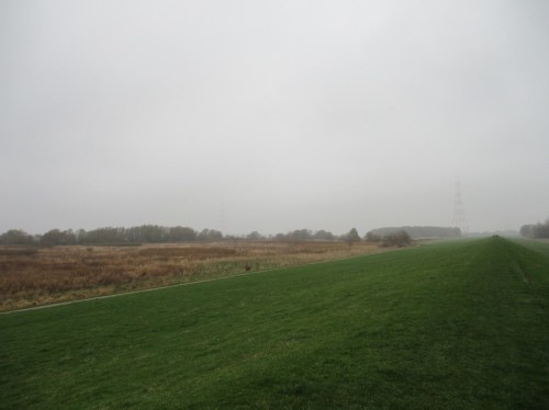 Blick längs des Deichs Richtung Stade – die Stromleitungsmasten der Elbquerung sind kaum zu erkennen.