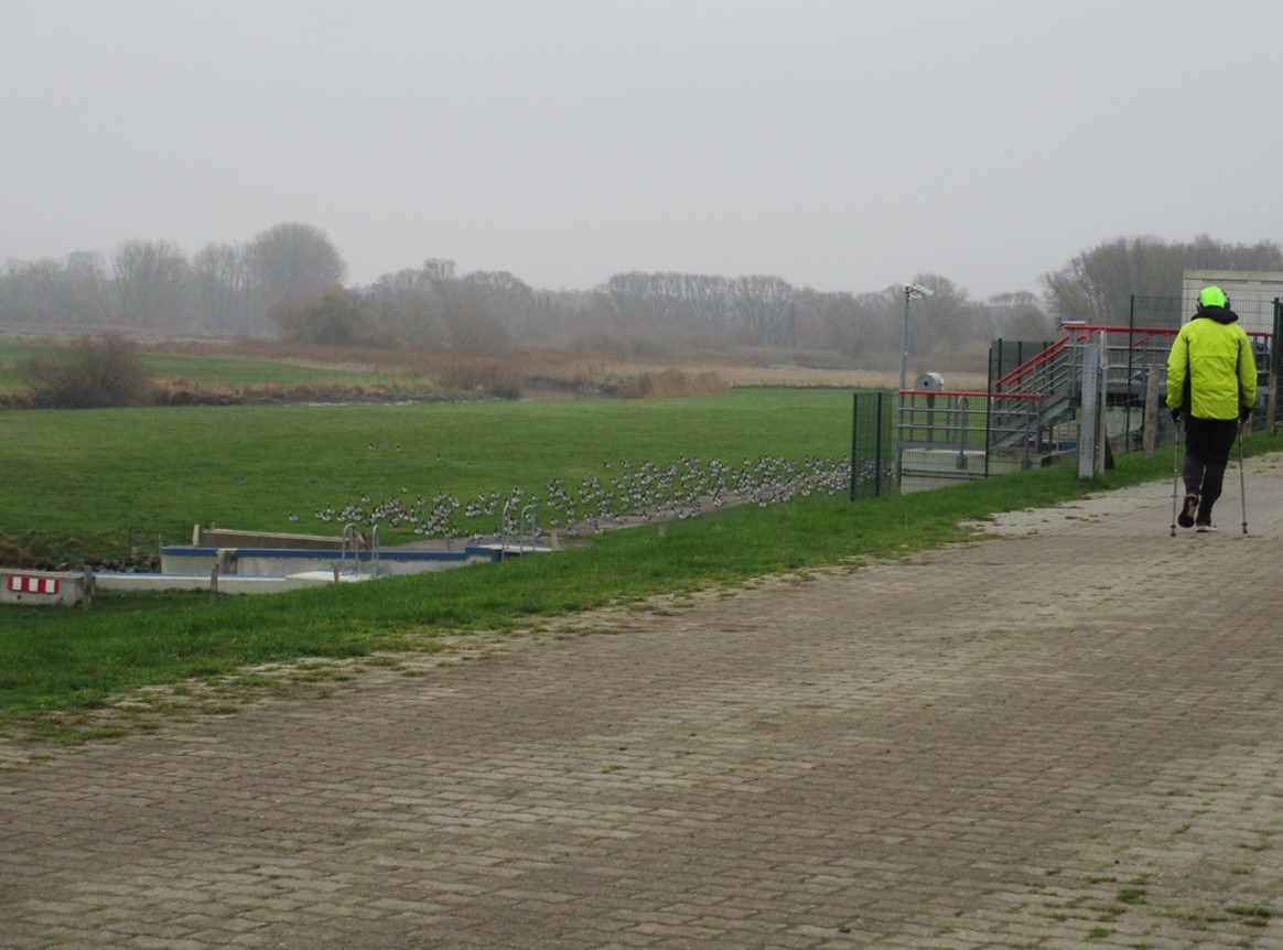 Sperrwerk Wedeler Au – Ostseite binnendeichs weicht eine gut 200er Gruppe Nonnengänse Richtung Binnenelbe aus.
