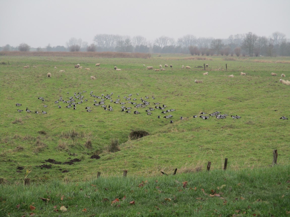 Kurz vor Queren der Wedeler Au, Erreichen des Geesthangs, äst eine Gruppe von etwa 100 Nonnengänsen auf einer Schafweide.