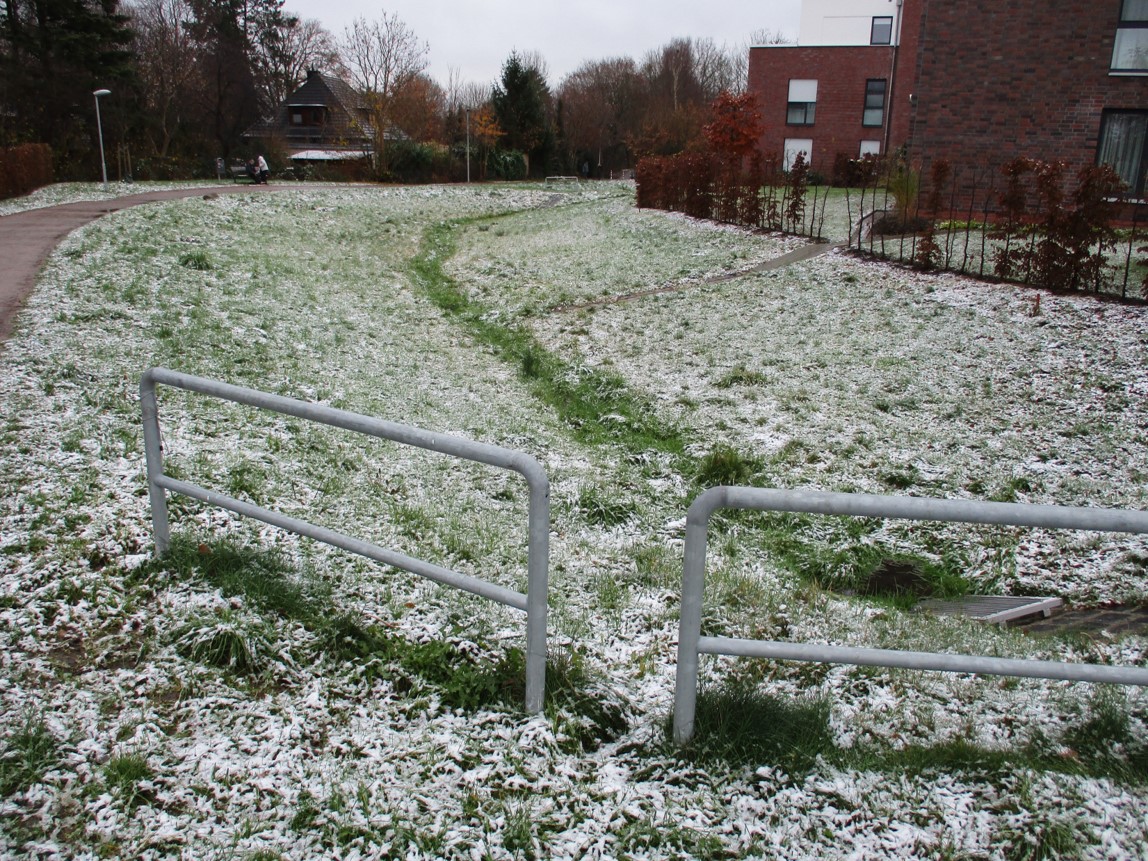 Angesichts der Straßensituation findet mein Frischluftschnuppern morgens zu Fuß statt – entlang des „Regenwasserpfads“ in einem „grünen B-Plan“.
