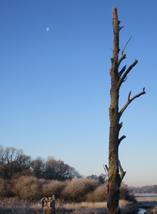 Hinter mir die Sonne, vor mir der Mond – ich fahre noch 10 Minuten bis zum Treff, an einem Nebenbach.
