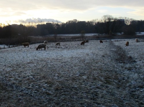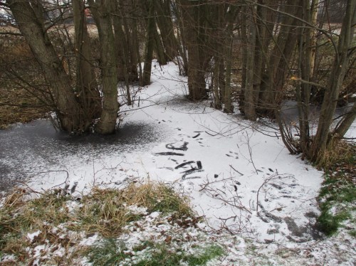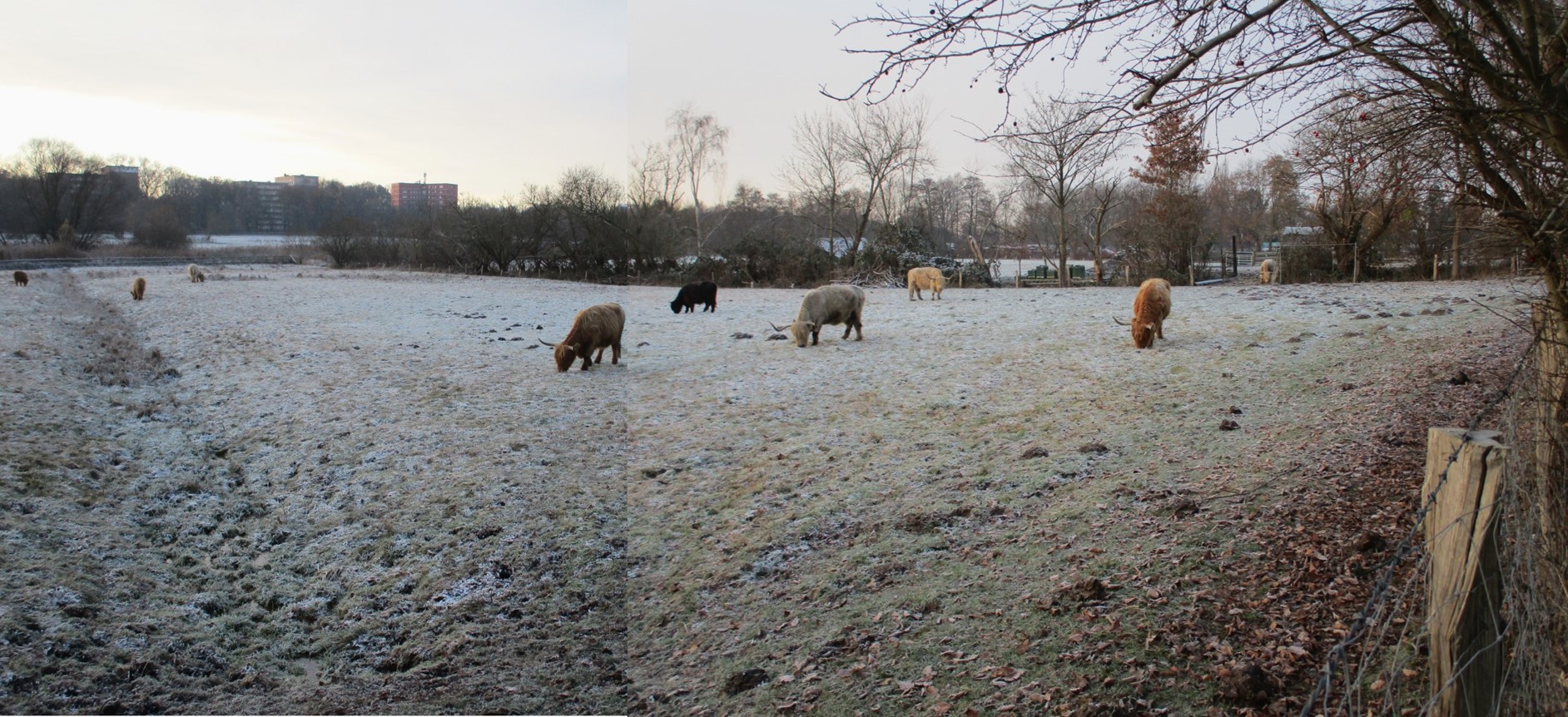 Teilaspekt, aus 2 Fotos zusammengestellt – mit Axt „bewaffnet“ ist der zugehörige Mensch auf der größeren Weide offenbar mit der zugefrorenen Wasserversorgung befasst.