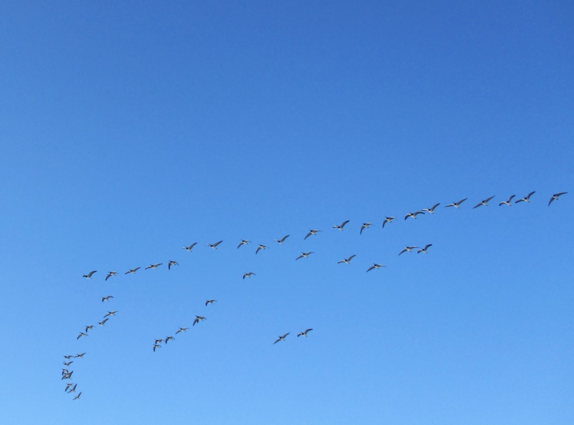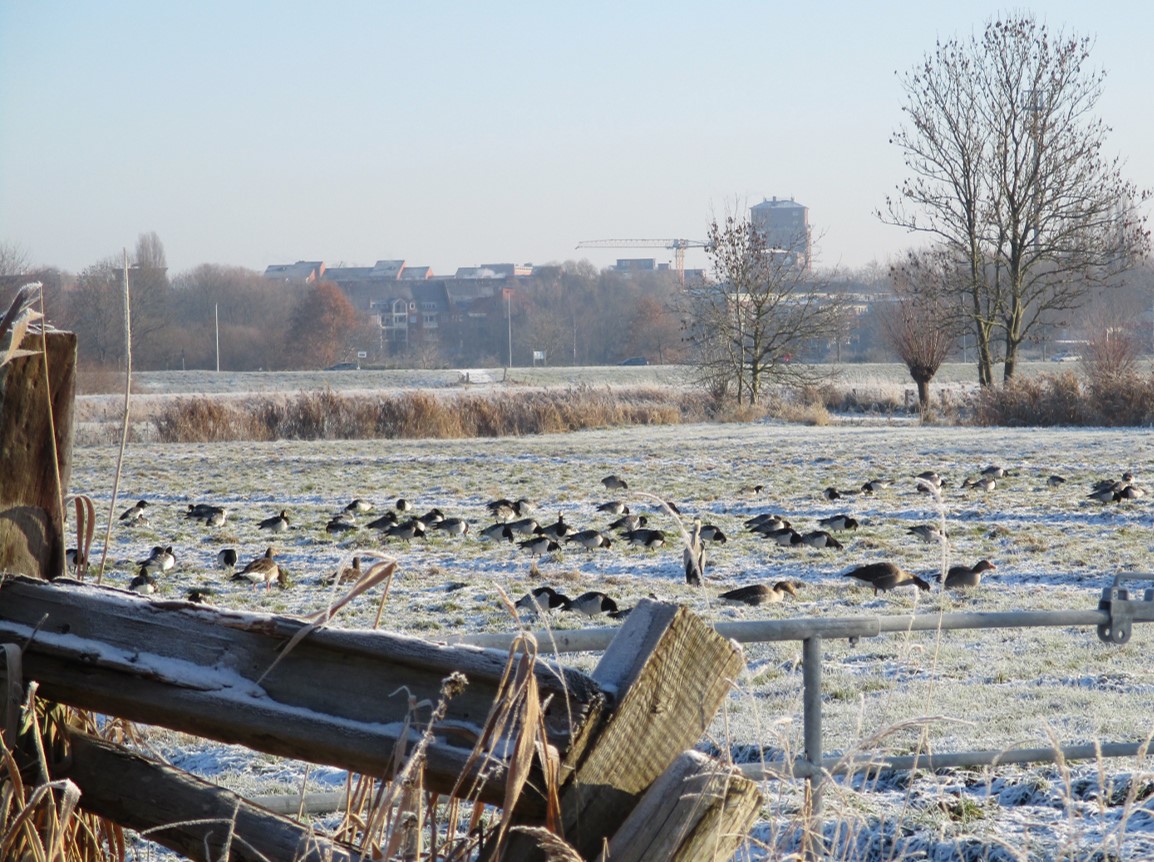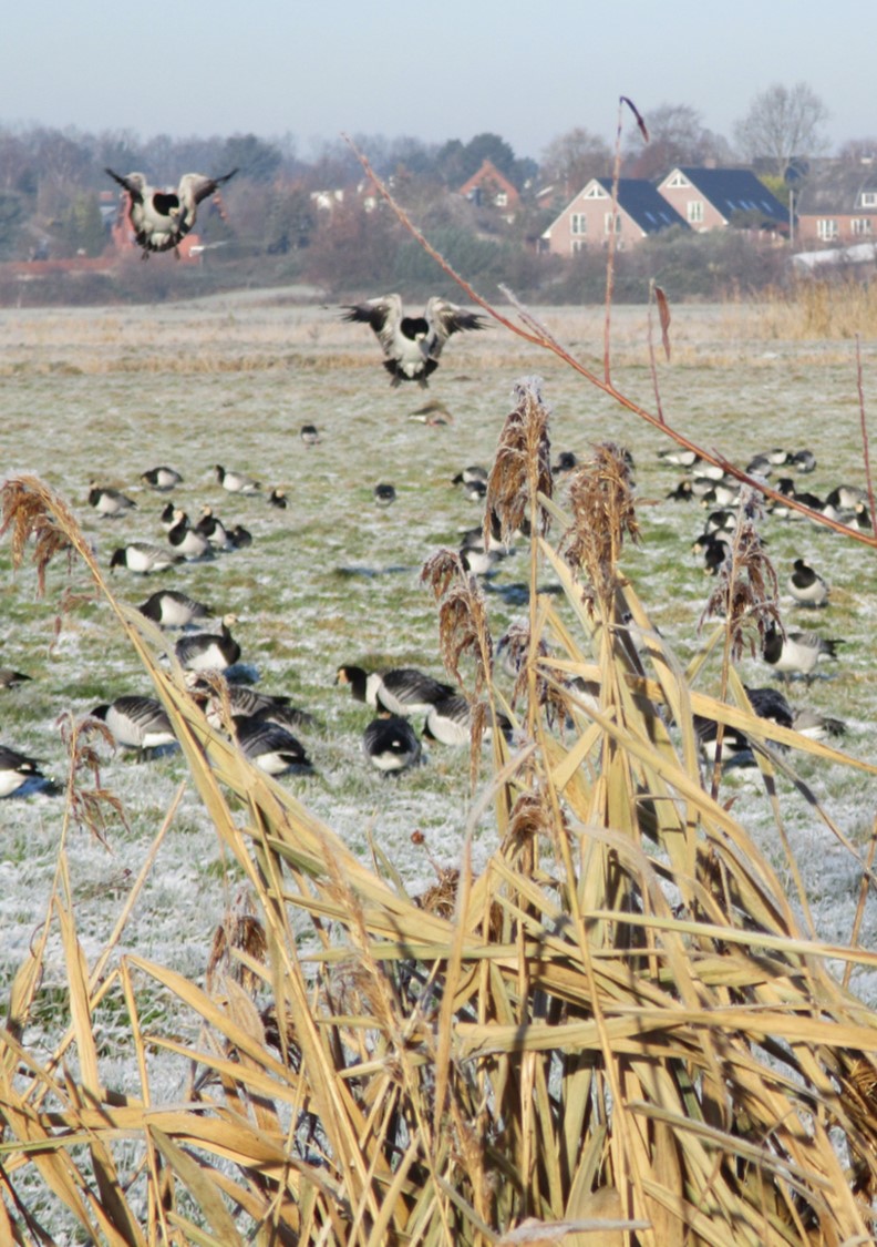 Deichvorland – wie ich anderswo an im Freien verbliebenen Schaf-, Pferde- und Rinderherden sah, stehen auch diese Vordeichrinder dicht beisammen. Eine Gruppe Nonnengänse fliegt an.