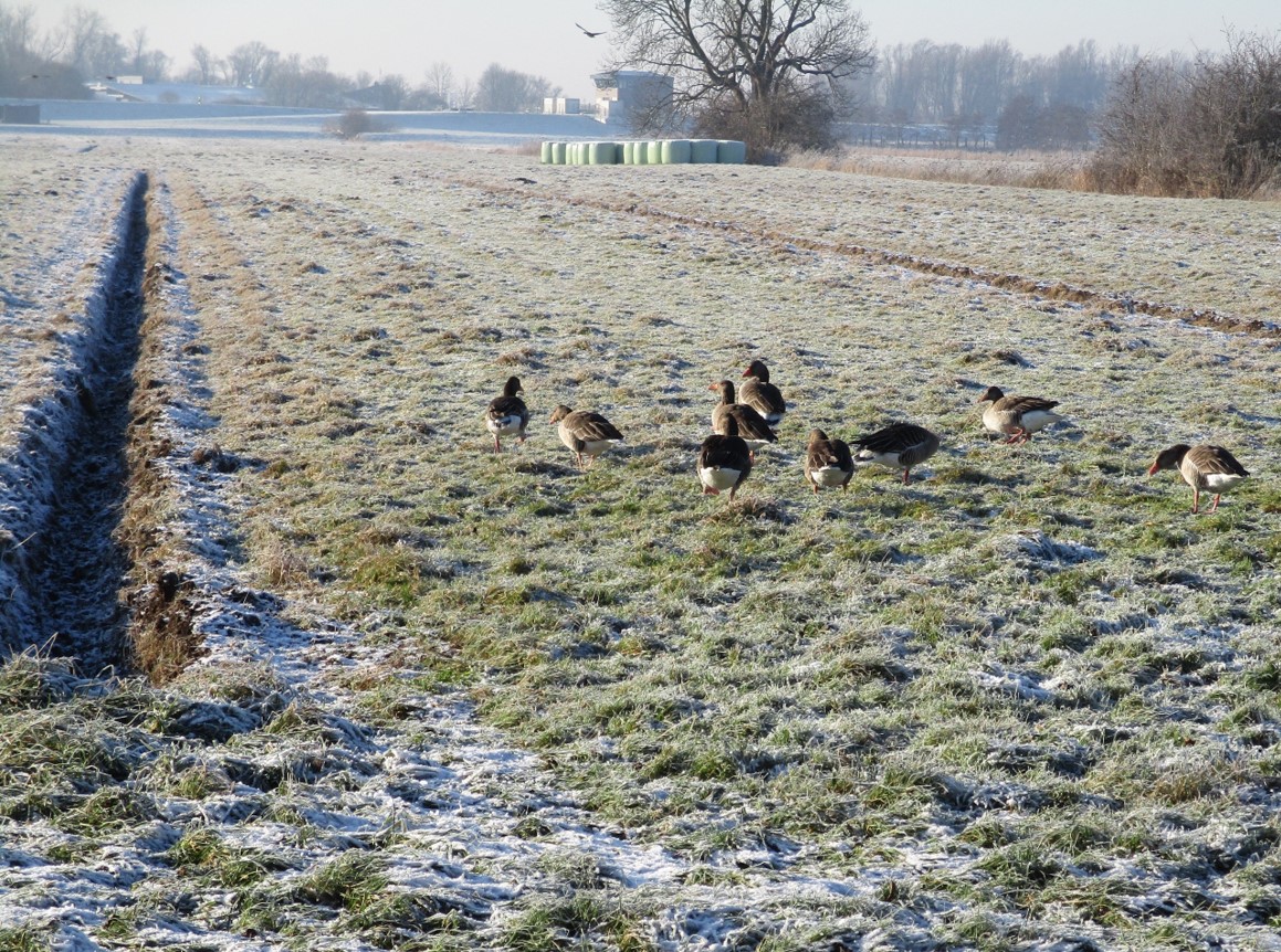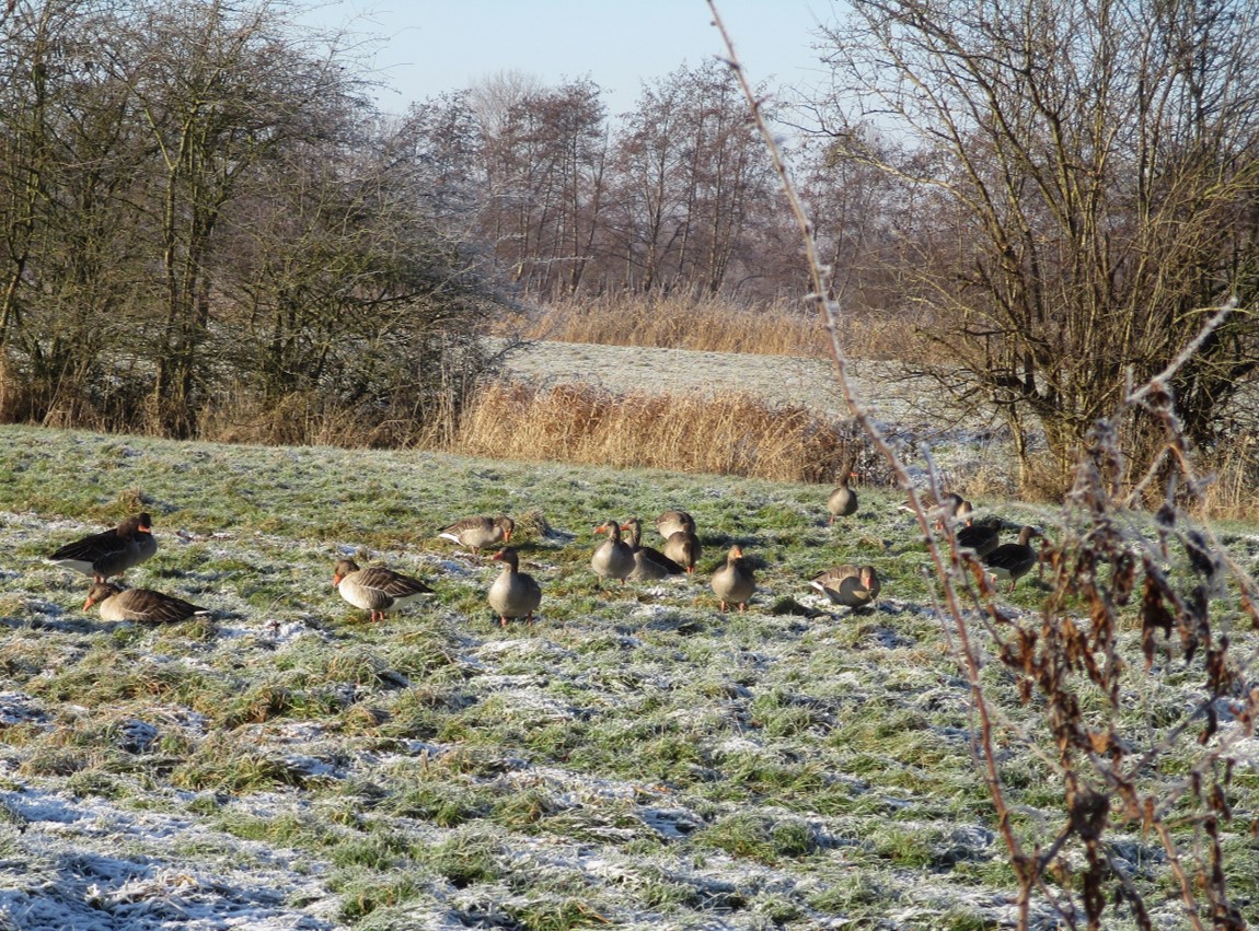 Auf dem Saatlandsdamm, kurz vor Wedel, Blick südwärts – Graugänse stehen ruhig, offenbar befindet sich hinreichend Sichtschutz zwischen uns.