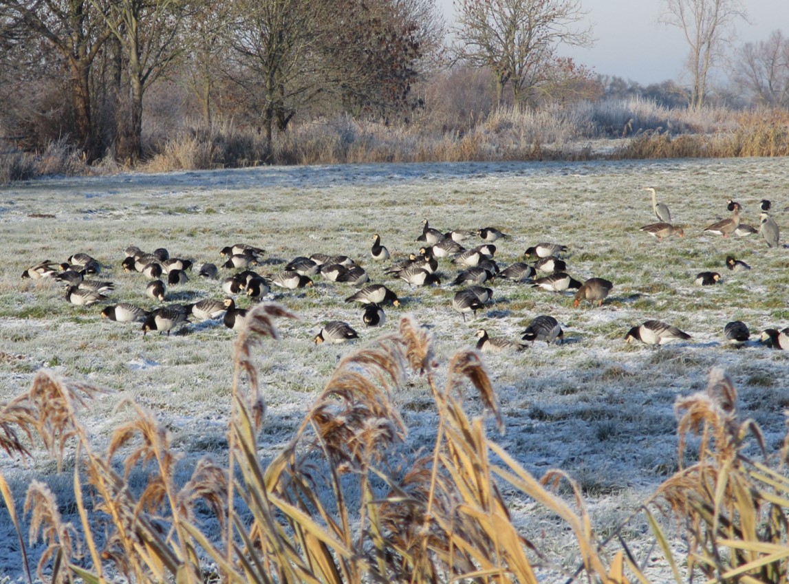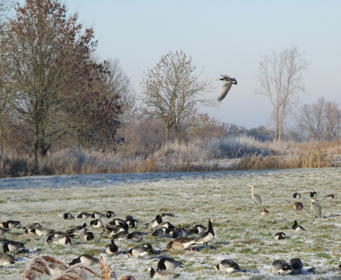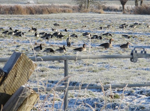 Grau- und Nonnengänse, Reiher befinden sich auf der Marschwiese. Ich kann mich immer wieder wundern, wie klein sich die Flugsilhouette-beeindruckenden Reiher in der Nähe von Gänsen stehend ausmachen.