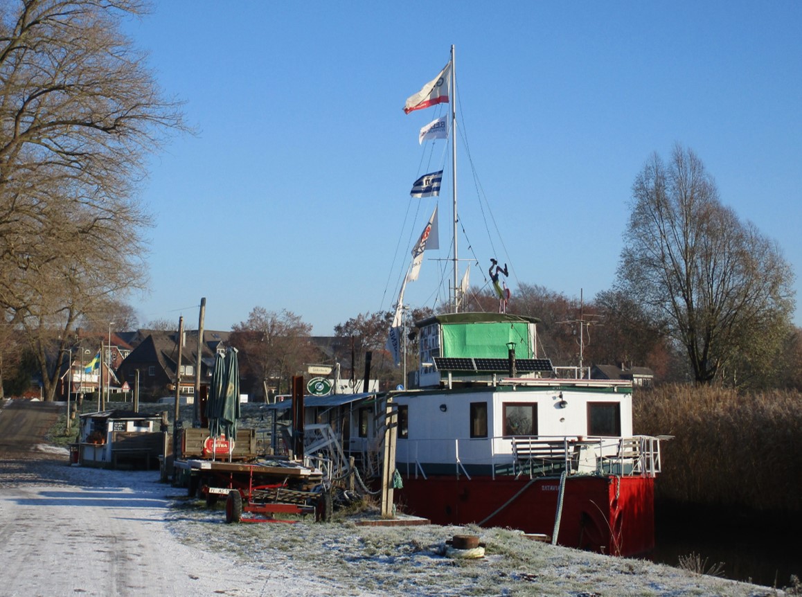 Sonnig, im Freiland aufgrund ziehenden Südwestwinds ordentlich eisig in der Wedeler Elbmarsch („wind chill“ – Sonne noch zu schwach gegen – 2 Grad im Schatten) – ich habe die Hetlingen-hinterm-Elbdeich-Wedel-Runde fast hinter mir (demnächst mehr dazu), klettere bei Fährmannssand auf den Deich.