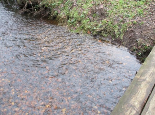 Die finden die Turbulenz der rauen Rampe, genau so wie die der Regenwassereinleitung offenbar prima. Hier ist das – verockerte – Laichbett unmittelbar bachab der Regenwassereinleitung zu erkennen.