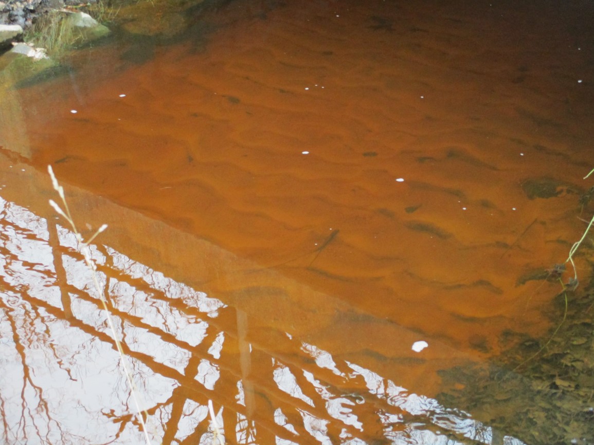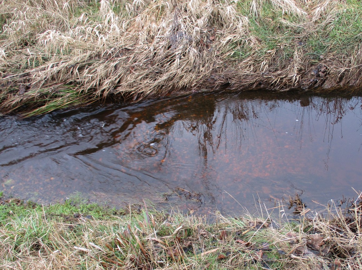 Angesichts unserer intensiven Bodennutzung bis in empfindliche Bereiche (wir haben nach wie vor kein Bodenschutzgesetz, das Boden in seiner Komplexität schützt!) führt großräumige, tiefe Entwässerung mit ihrem schnellen Ableiten jeglichen Wassers in speziellen Situationen zu direkten Einleitungen belasteten Wassers und zu hohen Frachten von Eisen. Bei hoher Turbulenz und rauer Struktur von Gewässersohle und -ufer fällt das Eisen recht schnell aus, bachab liegende Strecken sind entlastet. Eisen im Bach bei fehlender Turbulenz kennzeichnet diesen durch Waschmaschinenwasser-grau-milchigen Eindruck. In Ruhebereichen bilden sich an der Gewässeroberfläche Öl-artig wirkende Kahmhäute. Durch Berühren ist zu unterscheiden, um was es sich handelt. Bricht der „ölige“ Film, handelt es sich nicht um Öl-, sondern um Eisenbelastung des Gewässers.