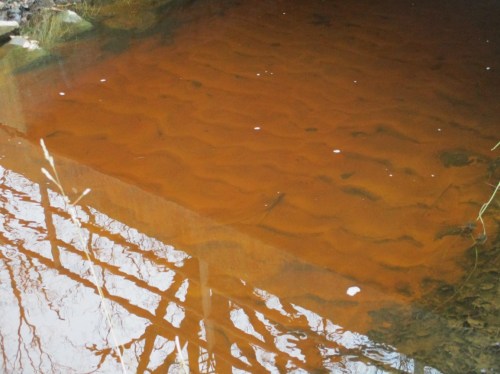 Bei frischer Umsetzung von gelöstem zu ausgefälltem Eisen, Ocker, kann so ein Bach ganz schön unnatürlich farbig anzusehen sein. Start orange, in weiterer Oxidation dunkelnd Richtung dunkelbraun. Begleitet eine Menge Mangan das Eisen, kann die Endfärbung der Oberflächen von Sohle und Ufer Richtung schwarz gehen.