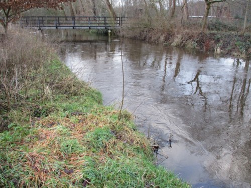 Blick bachauf vom Parkplatz am Bad zur Rosengartenbrücke: Frei fliesst die Mühlenau, Lenkbuhnen sind an Oberflächenturbulenzen erahnbar.
