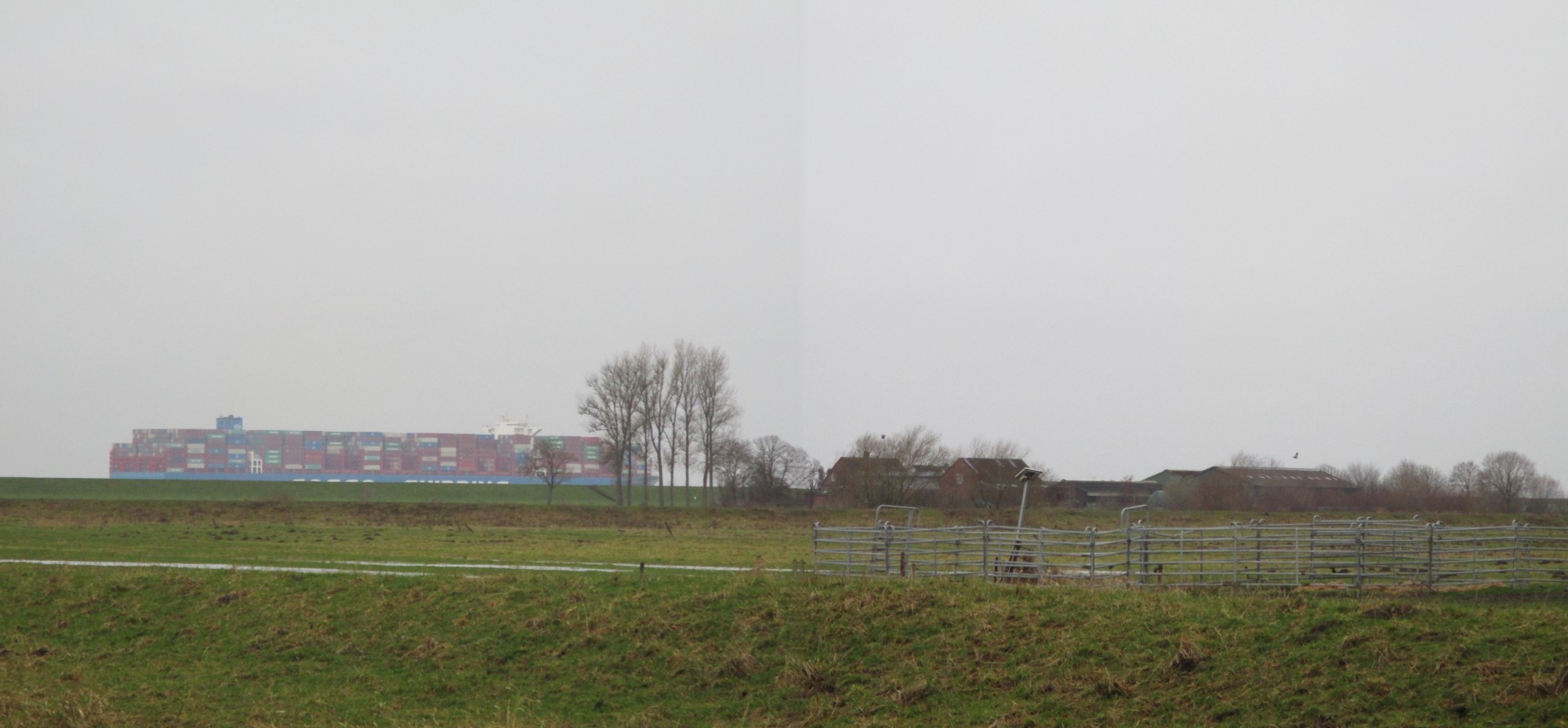Jenseits des Elbdeichs zieht ein Containerfrachter hinter dem Gehöft Fährmannssand vorbei gen Nordsee – man beachte das Größenverhältnis.
