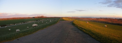 Das Foto zeigt die Ursache meiner obigen Bemerkung „vielleicht etwas zu spät“. Ich werde die Gesamtstrecke zurück nach Wedel auf der Deichverteidigungsstraße im Deichschatten fahren (vorn, Elbe-seitig in tiefstehendem Sonnenschein, hoppelt es mir zu sehr – dort habe ich von meinem alten Rad vor Jahren die Kunststoffteile vom Metall abgerüttelt).