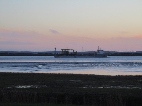 Auf dem Elbdeich querab Vogelstation – vor sinkender Sonne zieht der Hopperbagger Nile River gen Elbmündung, baggert HH-SH-Zwischenverklapptes, verklappt es unmittelbar nördlich Cuxhaven.