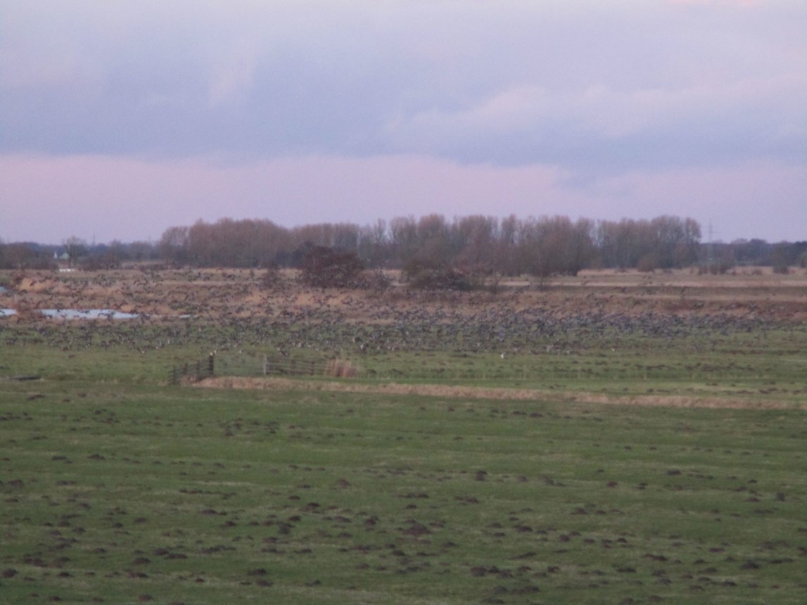 Lärm schräg hinter mir – Tausende Nonnengänse ziehen flach über die Marsch, suchen Nachtruhe offenbar nahe der Vogelstation.